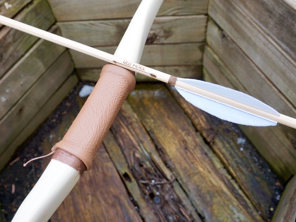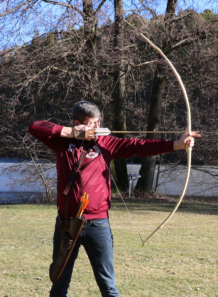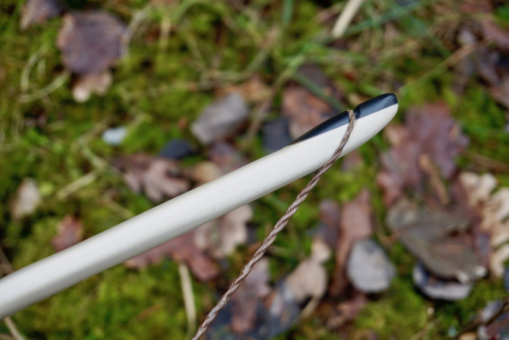 Hartriegel, 48@28, N/N: 164cm, Gewicht klpt: 380gr, gespleisst aus 2 zarten Hartriegelstämmchen, die beide an der dicksten Stelle nach dem Trocknen noch 22mm Durchmesser aufwiesen. Spleiss und Spleisswicklung(Leinengarn) mit Uhu Plus, Sehne Brownell Fury, Nocks aus Reststücken des Hartriegels, Finish mit 2 Lagen Leinölfirnis und geklebter Griff aus 4mm starkem Leder. Der Bogen durfte mich bereits mehrfach auf den Parcours begleiten, und wusste dabei durchaus zu gefallen.