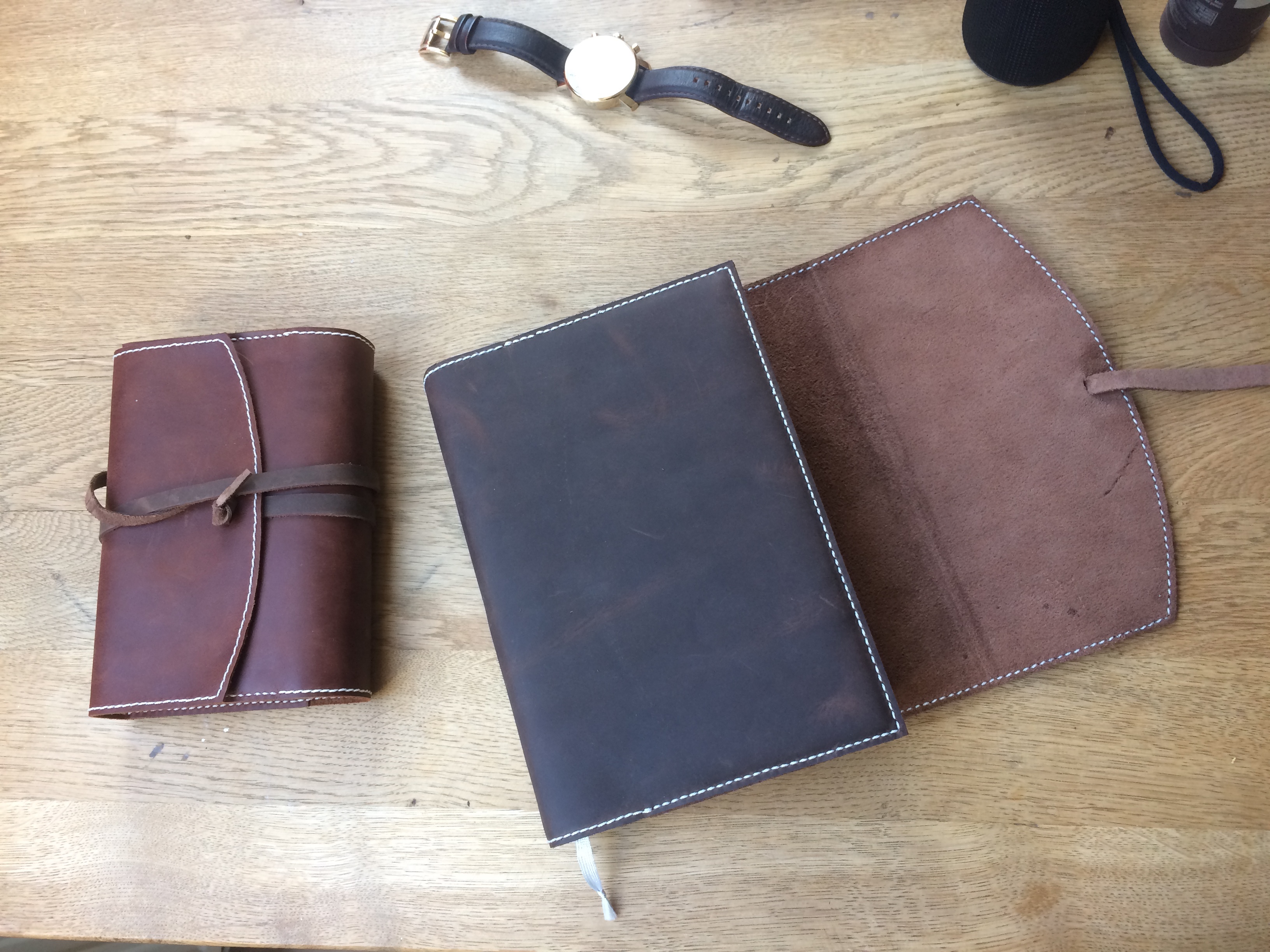 Die beiden Hüllen unterscheiden sich eigentlich nur durch das verwendete Leder. Das Leder für den Zweitschlüssel ist nur 1 mm dick, die andere 2,2 mm. Natürlich lässt sich das leichter nassformen ist beim nähen aber deutlich empfindlicher. Ich vermute auch diese Hülle wird nicht lange “leben“ ich habe beim quasi letzten Stich zu fest gezogen und das Leder durchtrennt.