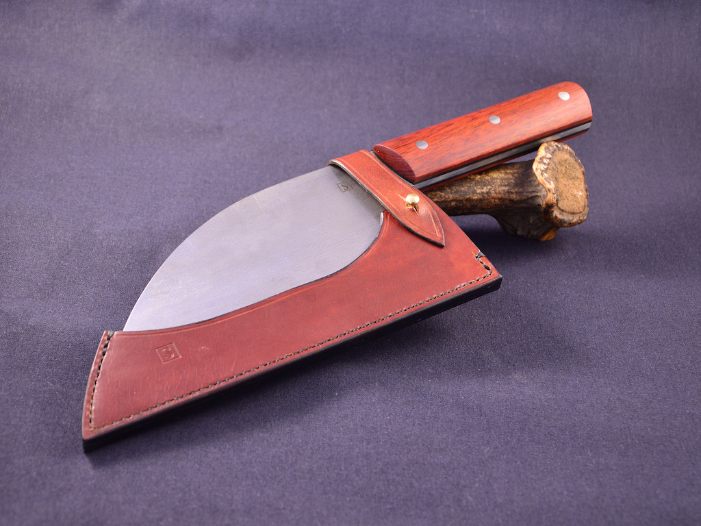 Griff: Couepia grandiflora oder auch Sweet Angelim (war eine Abfallstück vom serbischen Kochmesser), rotes Fiber und Edelstahl