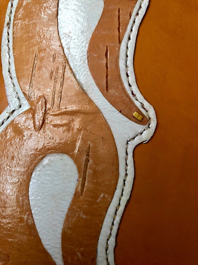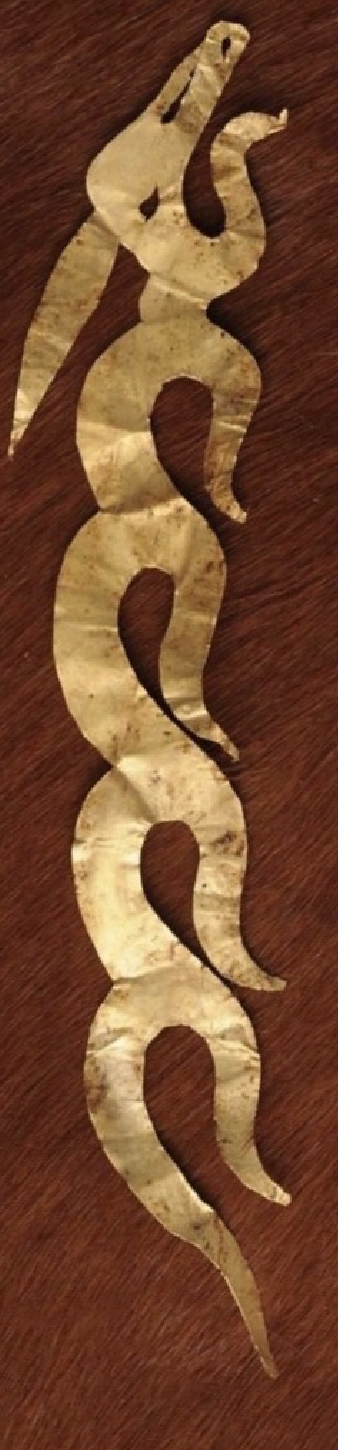 Die Birkenrindenapplikation aus einer Inspiration von skytischen Tierbilddarstellungen. Dezent mit Blattgold.
