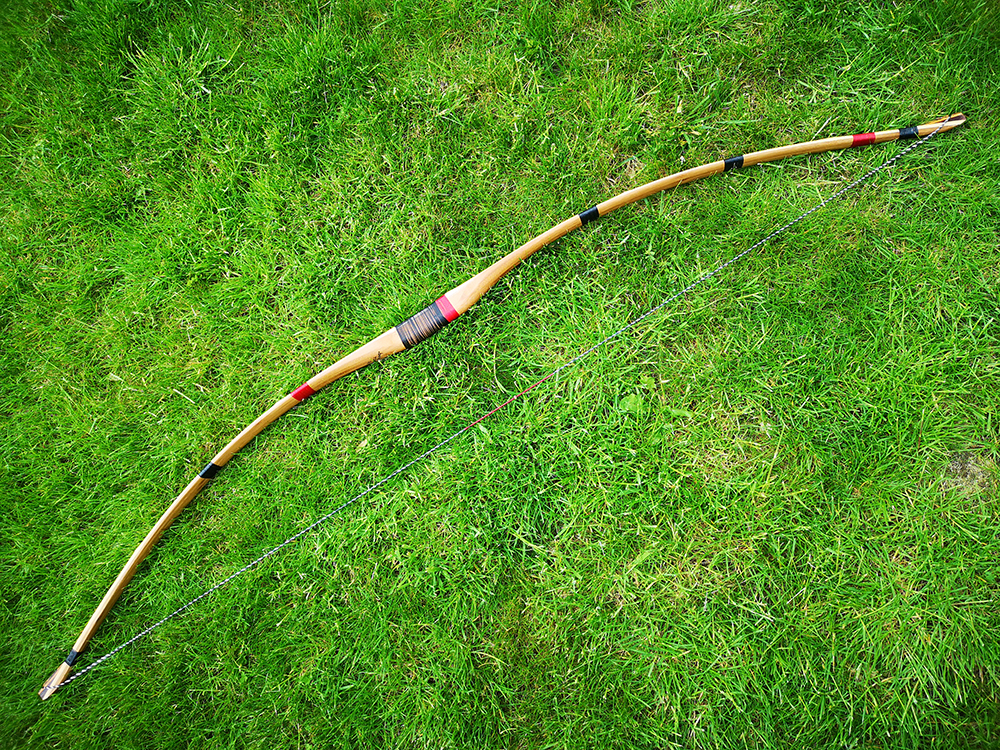 - Umwicklungen am Bogen aus Schustergarn gewachst in schwarz und rot