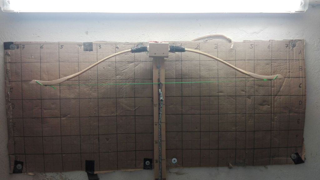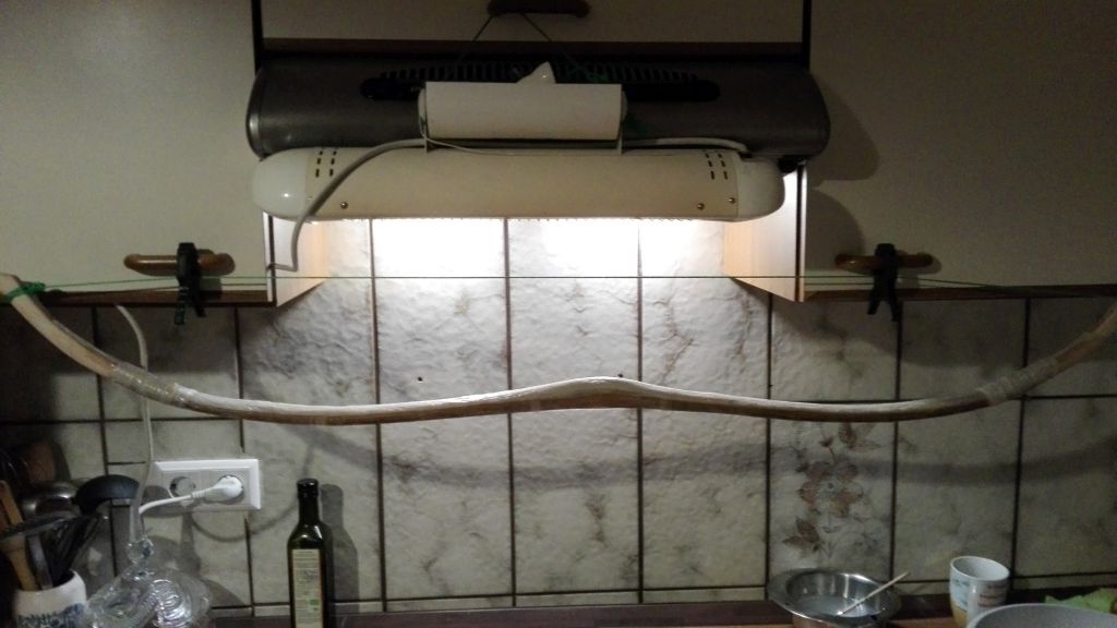 Heute bekam der Assyrer seine 1. Sehnen Schicht. Wie immer erst mit 10%tigem Hautleim grundieren und mit 25%tigem Hautleim die Sehnen aufbringen. Gestern bekam er die endgültige Form, dabei habe ich festgestellt, dass der Bogen sich leicht zu Seite verzieht. Nachdem er mit Hosengummis umwickelt wurde, habe ich ihn so fixiert , dass er gerade bleibt und so kann er nun trocken. Sollten Druckstellen entstehen kann ich die mit den nächsten 2 Schichten wieder ausgleichen. Ist auf jeden Fall besser als ein verzogener Bogen.