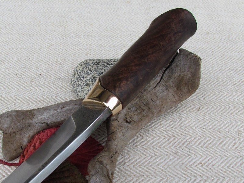 Die Klingenform finde ich sehr elegant und ansprechend, der Griff ist ergonomisch - ich mag die Verdickung zum Griffende, gibt der Hand guten Halt. Das Nussbaumholz ist ein ausgesucht schönes Stück und auch die Messerscheide ist top. Passende Farbe, klasse Leder, versenkte Naht.
