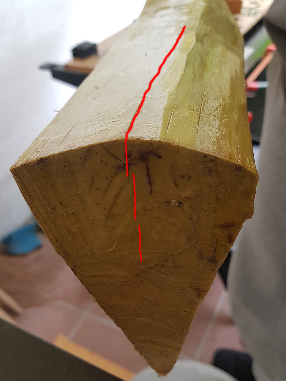 * Mein nächster Schritt wäre das Freilegen von dem Jahresring, und das Aufzeichnen vom Bogenprofil. Sollen die Trocknungsrisse möglichst mittig im Bogen zu liegen kommen?