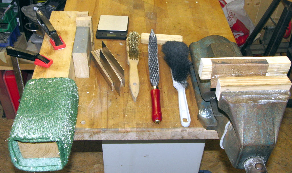 Die verwendeten Werkzeuge waren heute Schraubstock, Schraubzwingen, Sägeraspel, Messingdrahtbürste zum Reinigen der Raspel, Ziehklingen, Besen und Waage.