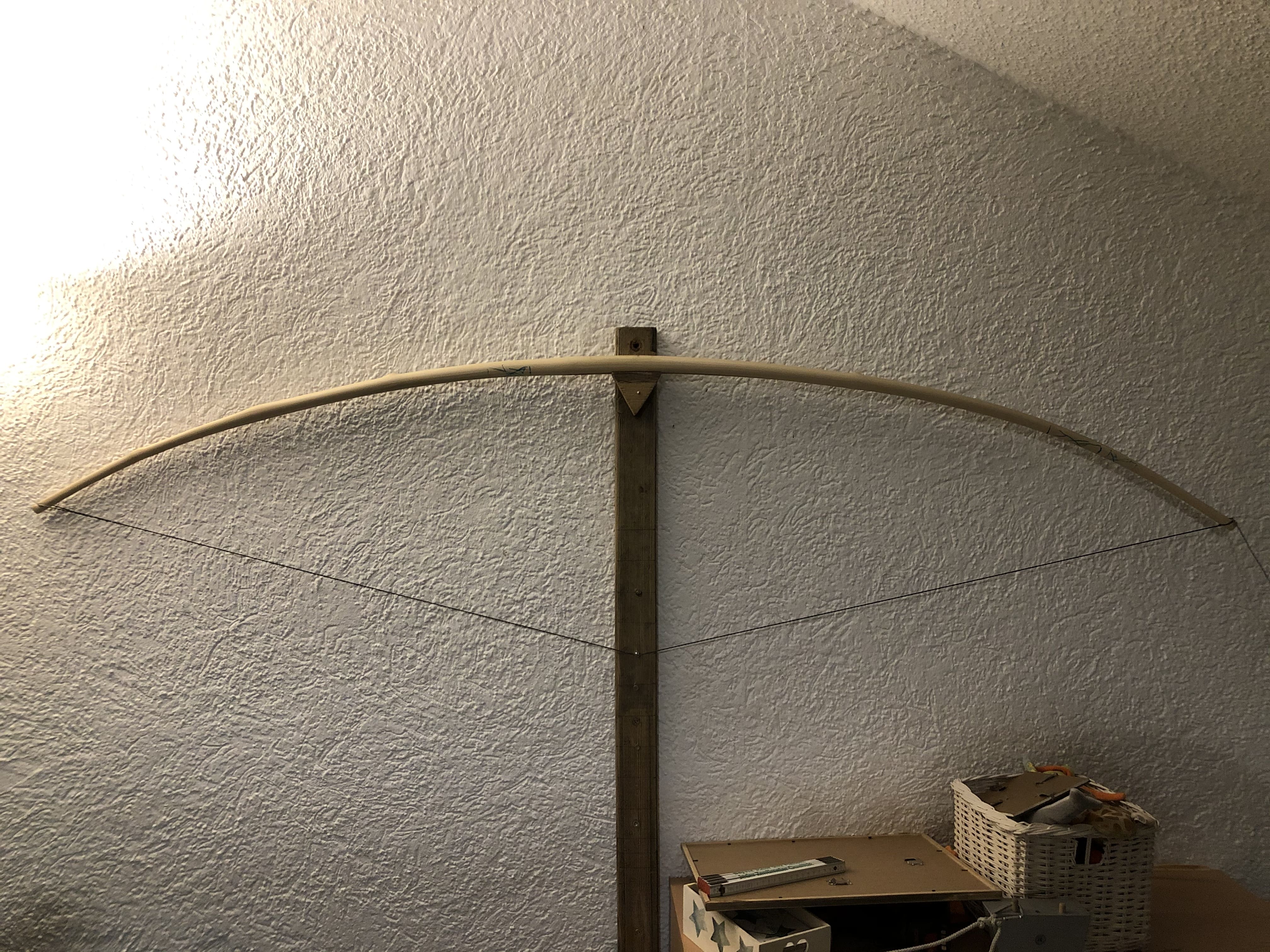 Heute hatte ich wieder Zeit für den Holler und ich habe ihn zum ersten Mal richtig gespannt, mit geringer Standhöhe (13 Zentimeter, gute fünf Zoll). Insgesamt habe ich nicht das Gefühl, irgendwas besser zu machen. Der rechte WA biegt im letzten Drittel immer noch viel zu stark.