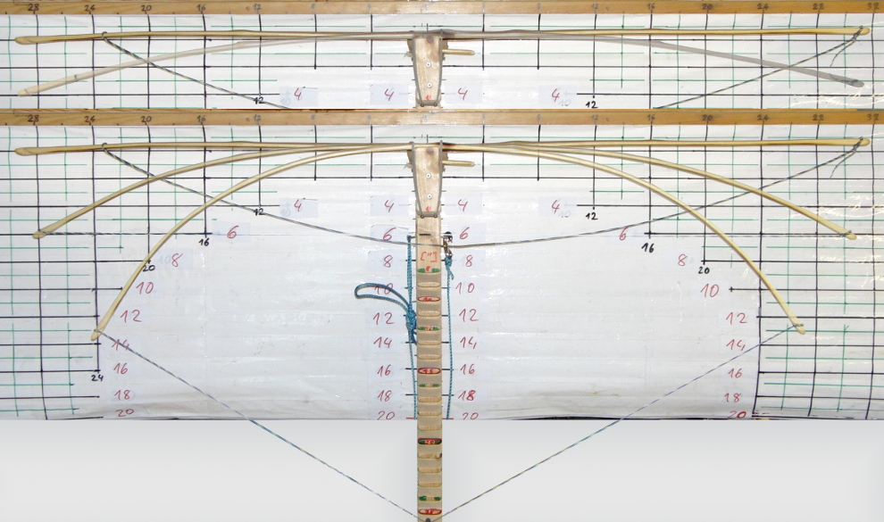 Die Masse des Bogens beträgt 321,5 g, eine passende Sehne mit zwei flämisch gespleißten Öhrchen aus 2 x 3 Strängen Spectra, doppelter Mittenwicklung und Messingnockpunkt bringt gerade mal 2,8 g auf die Waage.