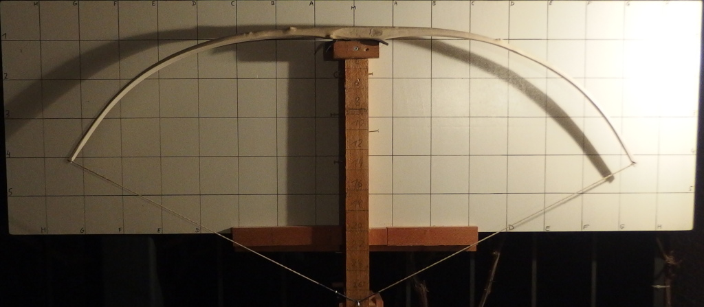 So, heute morgen noch etwas gemacht. Da es links in der Mitte des Wurfarms mehr biegt, mußte ich woanders was machen. Man siehts auch, wenn man ein Brettchen drüberschiebt (Tiller Gizmo für Arme sozusagen ;D ).
