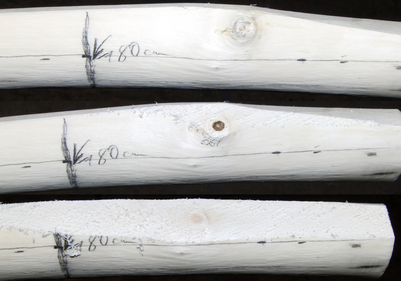 Die am 12.01. geernteten Pfeilschäfte haben in 14 Tagen bei 7 - 10°C und 50 - 65 % r.F. Ein knappes Viertel ihres ursprünglichen Gewichts verloren. Das wären 66,5 g Wasser. Gegen Ende der Phase haben die Schäfte noch 1 g Wasser in 12 h verloren und sind ins Haus bei 18 - 20°C und 40 - 50 % r.F. umgezogen und haben dort in ca. 18 h 7 g Feuchte verloren. Während der ersten Trockenzeit hat ein Schaft an einem Auge einen sichtbaren Trockenriss gezeigt und ist somit wohl aus dem Rennen.