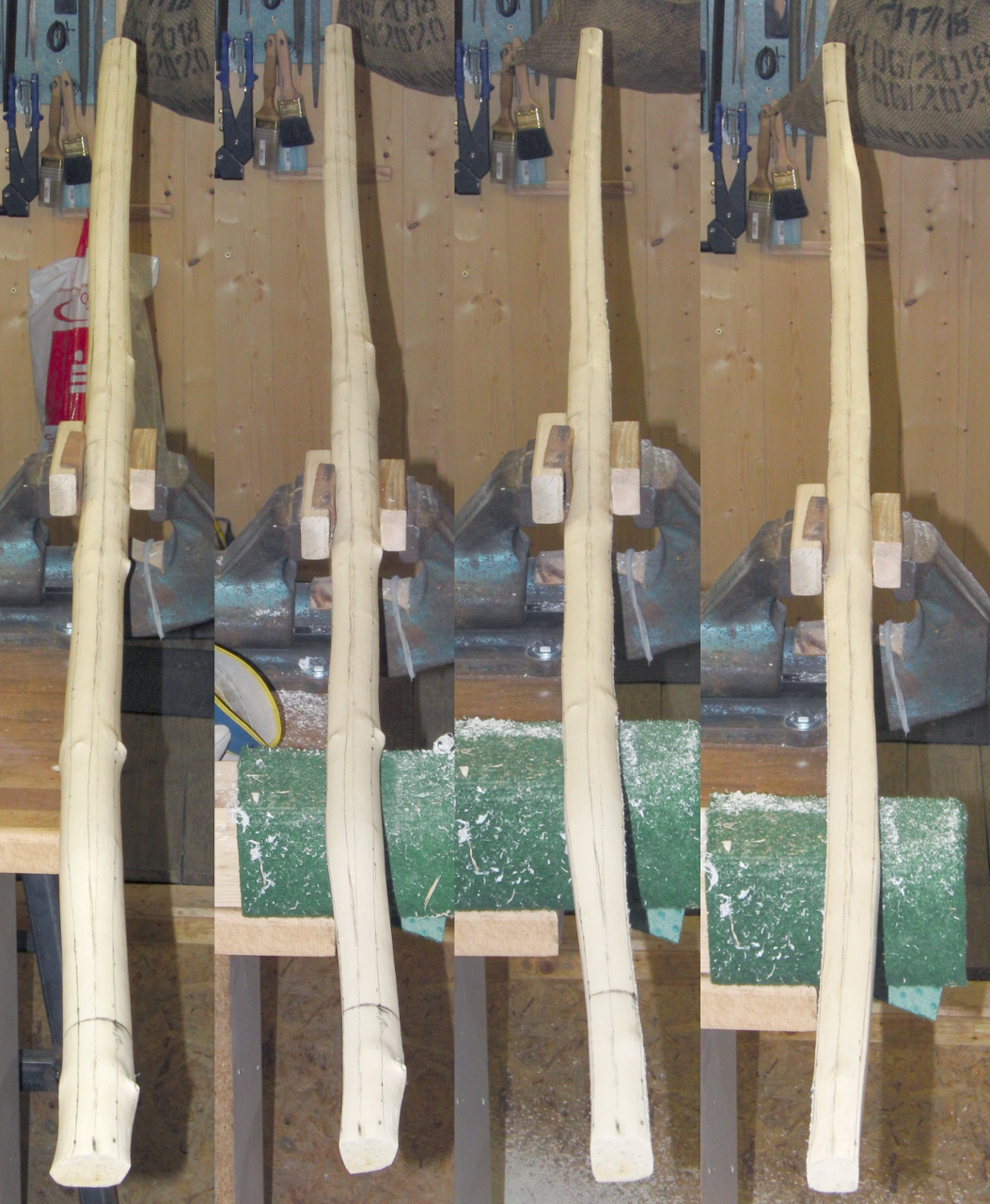 Der Rohling hat in jedem Wurfarm einen ungünstig gelegenen Totast im Biegebereich. Im weiteren Verlauf werde ich diesen wohl mit einem hierauf dressierten großen nachtaktiven Waldvogel auf den Pelz rücken