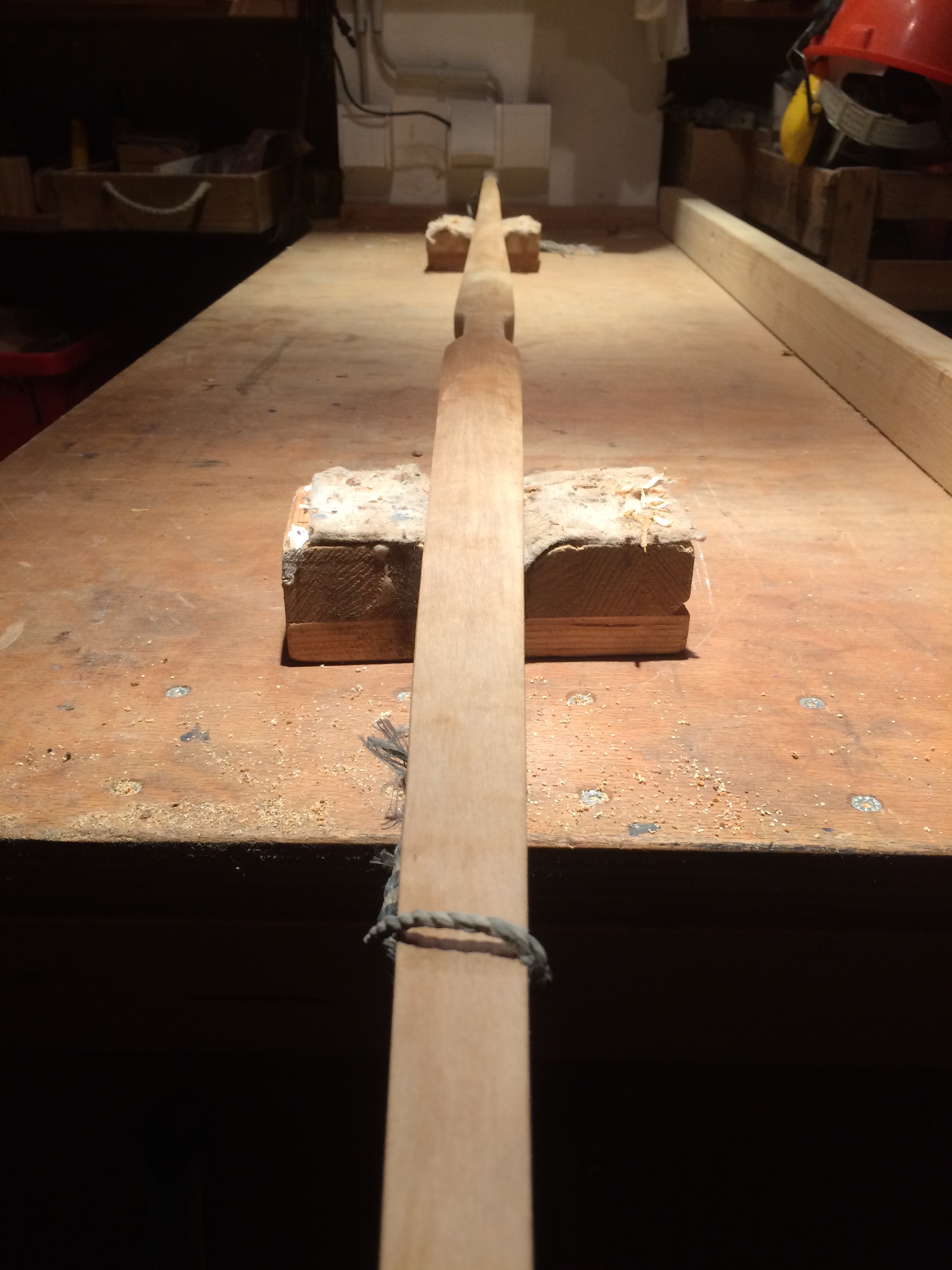 Liegt die Sehne nicht mittig hinter dem Wurfarm (...), heißt das, dass diese Wurfarm auf der Seite, zu der er sich neigt, schwächer ist. Dann muß man ihn auf seiner steiferen Seite schwächen indem man dort Holz entfernt