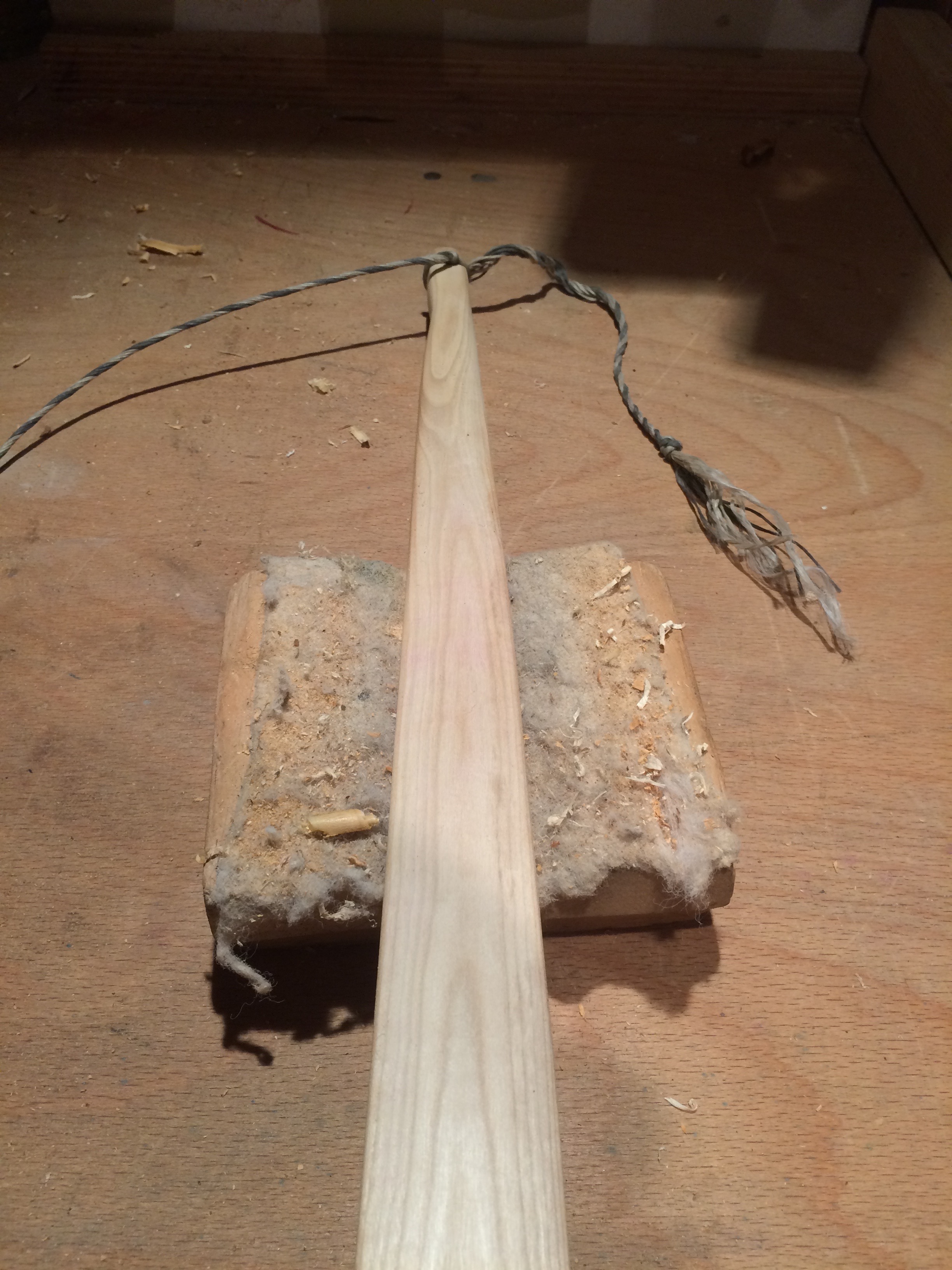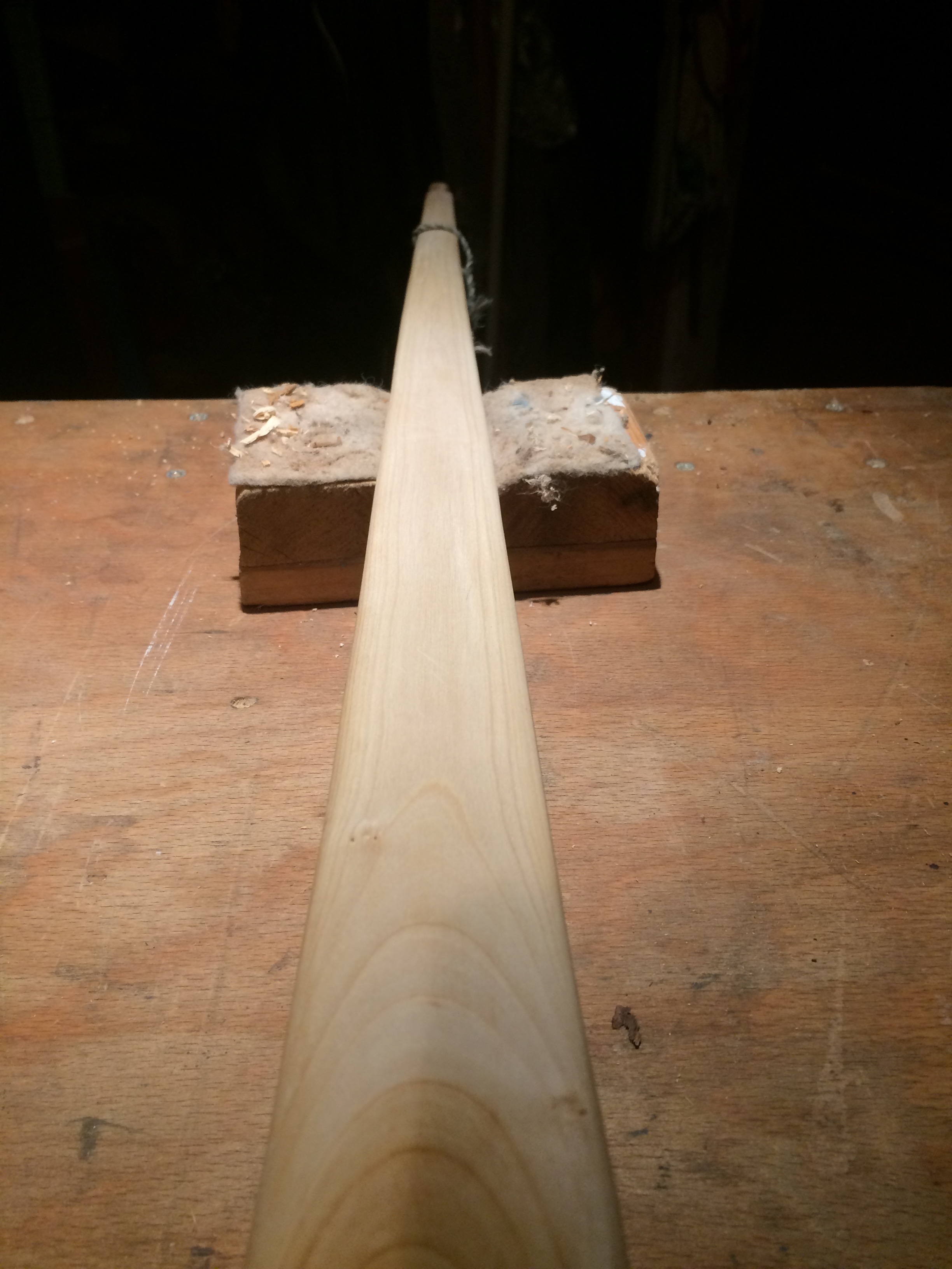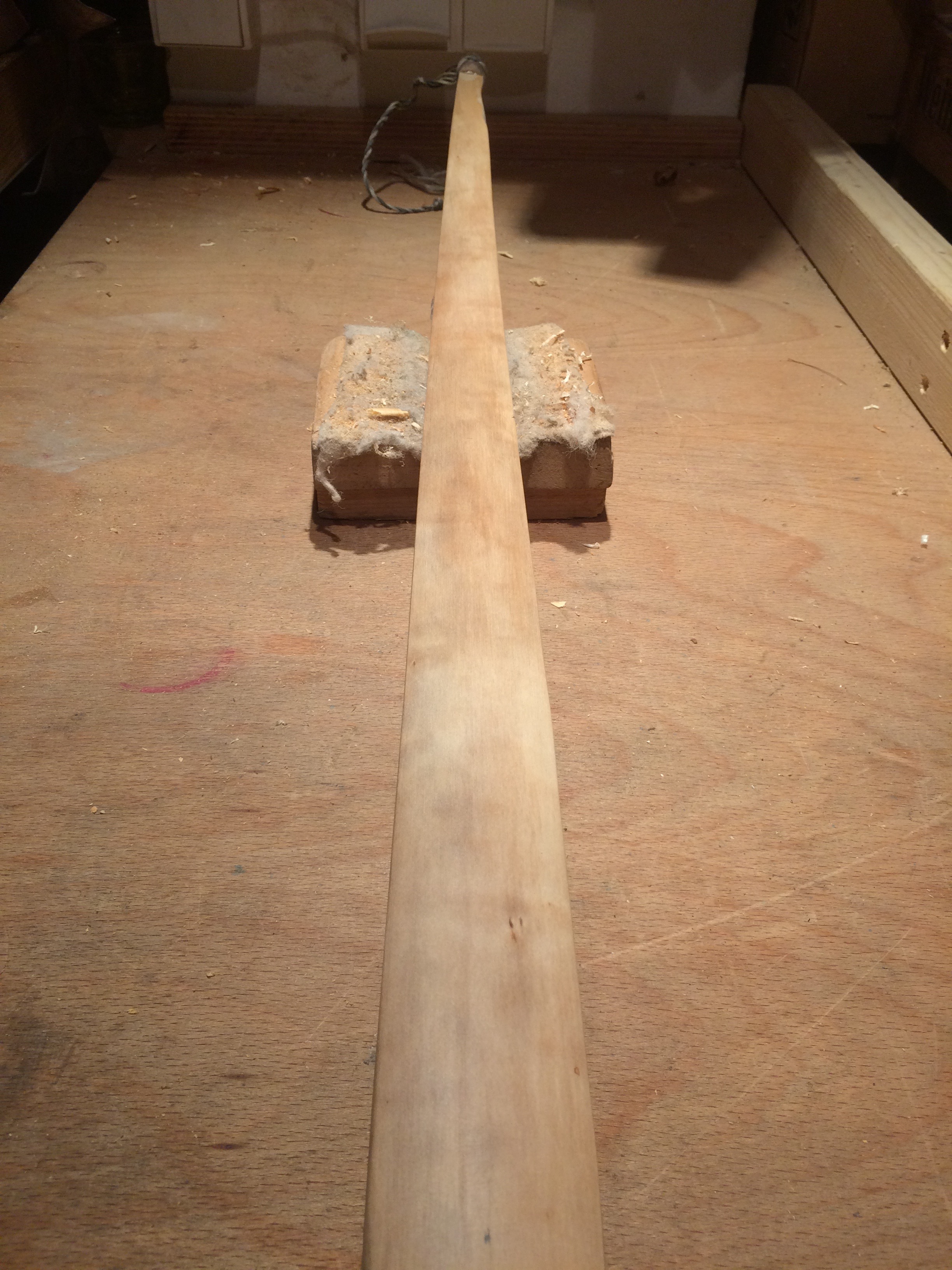 Zum Wiedereinstieg hab ich mir ein, vermeintlich, einfaches Projekt vorgenommen: Einen Flachbogen aus einer nicht näher bekannten Kirschart. Den Stave hab ich vor Jahren aus einem Polder gezogen. Da war ausser der Rinde nichts zum Bestimmen vorhanden. Das paßt aber schon weil das Zuggewicht lediglich irgendwo zwischen 30 und 40 raus kommen soll. Das müßte mit jedem Prunus zu machen sein. Soweit nichts besonderes.
