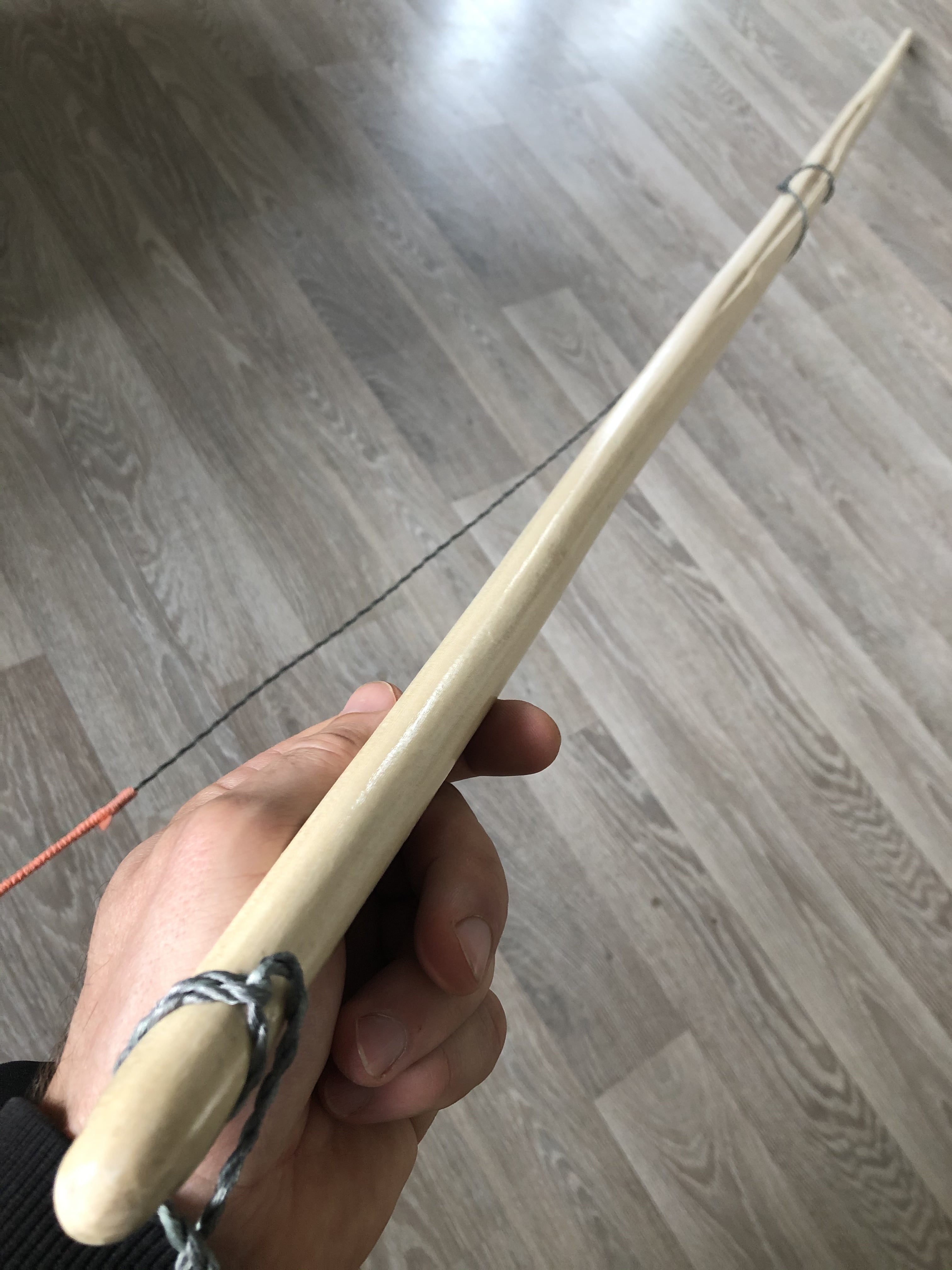 Das Finish besteht aus Stahlwolle-Schliff und drei Schichten Parkett-Versiegelung, die Sehne habe ich aus zahlreichen Metern geflochtener Angeschnur gedreht, die hier noch in der Schublade lag. Funktioniert bestens.