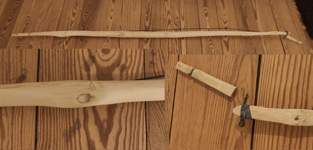 Ich stiefelte im Wald umher, eigentlich auf der Suche nach Siya-Rohlingen ... und fand ein Stöckchen, dass unbedingt mit nach Hause musste. Es wurde fürs Trocknen vorbereitet, heißt im Griff längs eingesägt und die Wurfarme abgetragen, sowie Enden und Fadeouts versiegelt. Dann trocknete das Stöckchen auf eine Massabohle festgezurrt. Die Wurfarme etc wurden geformt. Durchs trocknen fügten sich stattliche 20cm Reflex hinzu. Diese sind nun weg. Die Sehne verlief nicht mittg. Das lag daran, dass der Wurfarm sich an einem Ende noch meinte unbedingt zur Seite verziehen zu müssen. Was ein Doofkopp! Also heimlich mit der Säge, Ritzeratze! Und weg war der Dreck. (Bildausschnitt unten rechts)