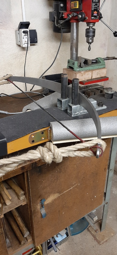Der Bogen ist 6 5 mm dick . In der Bogenmitte ist er 40mm breit und verjüngt sich nach außen auf 20mm. Aussen ist er auch etwas dünner. Nachdem ich den Bogen fertig habe wird eine Sehne gewickelt. Dann auf der selbstgebastelten Ziehbank die Auszugslänge festlegen und mal sehen was da für eine Zugkraft entsteht.Bin mal gespannt!