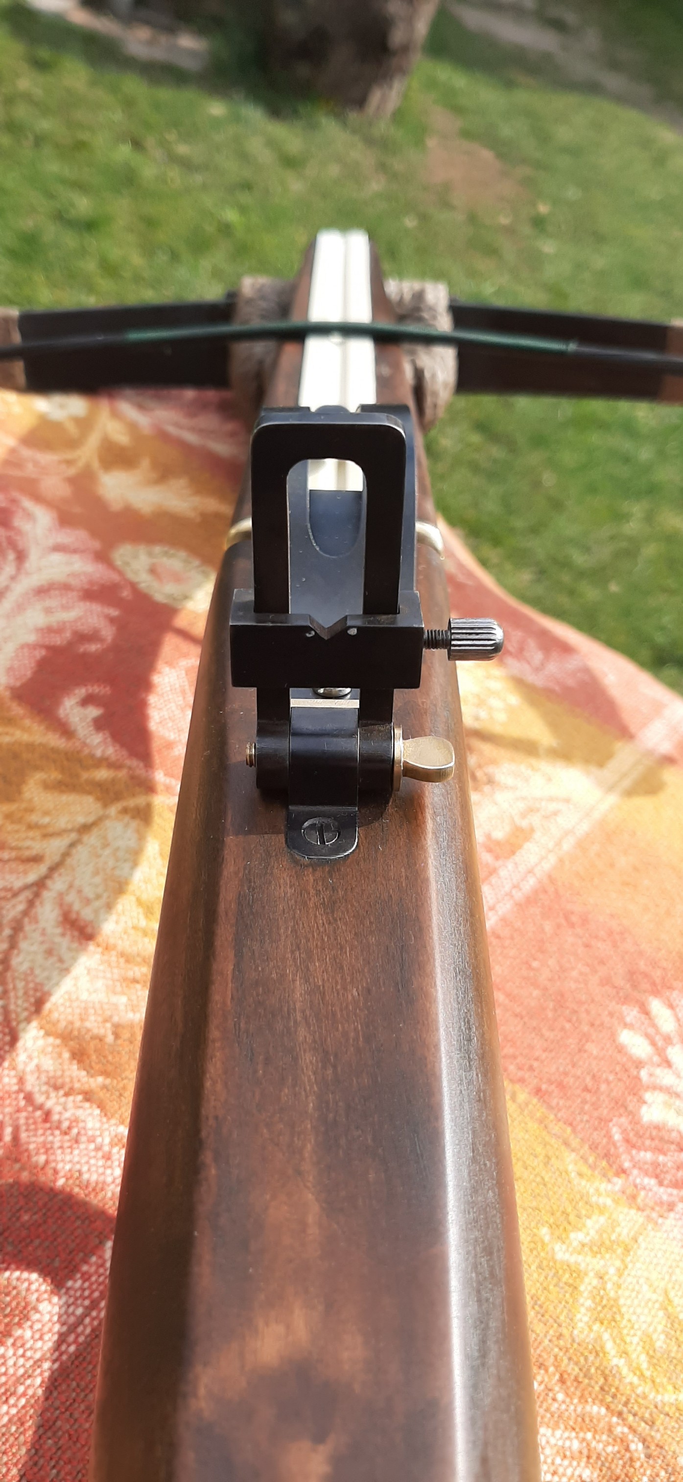 Visier habe ich jetzt ca. 2mm nach links verstellt. Jetz passt es. Ich komme mit dem Visier auf gute 40 Meter. Aber darüber wird es schwierig zu zielen. Die Pfeilspitze dient ja sozusagen als Korn und da wird es dann zu grob um genau zu zielen. So wie eingestellt passt auf 30 m. Die obere Markierung passt dann auf 40m.