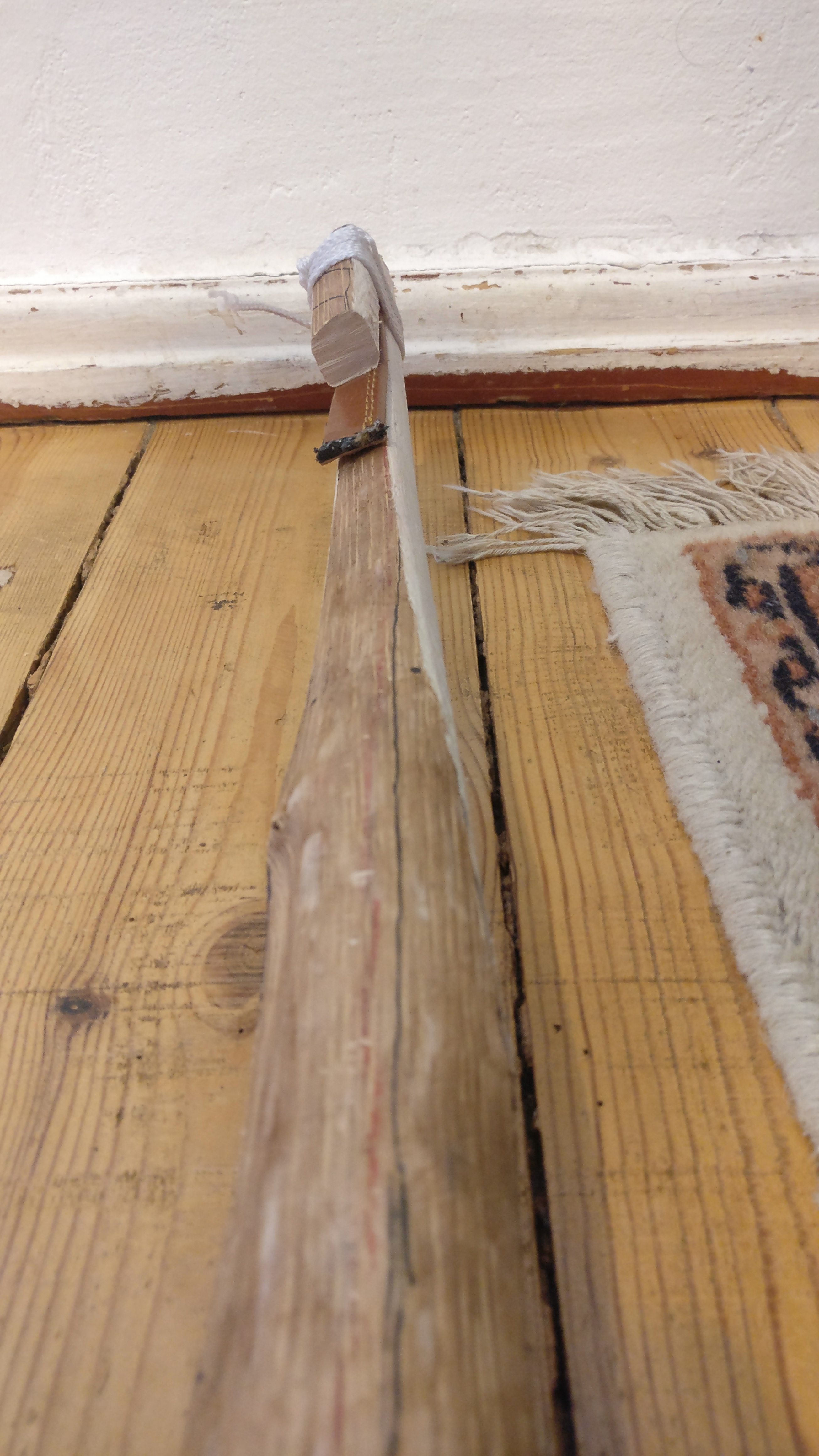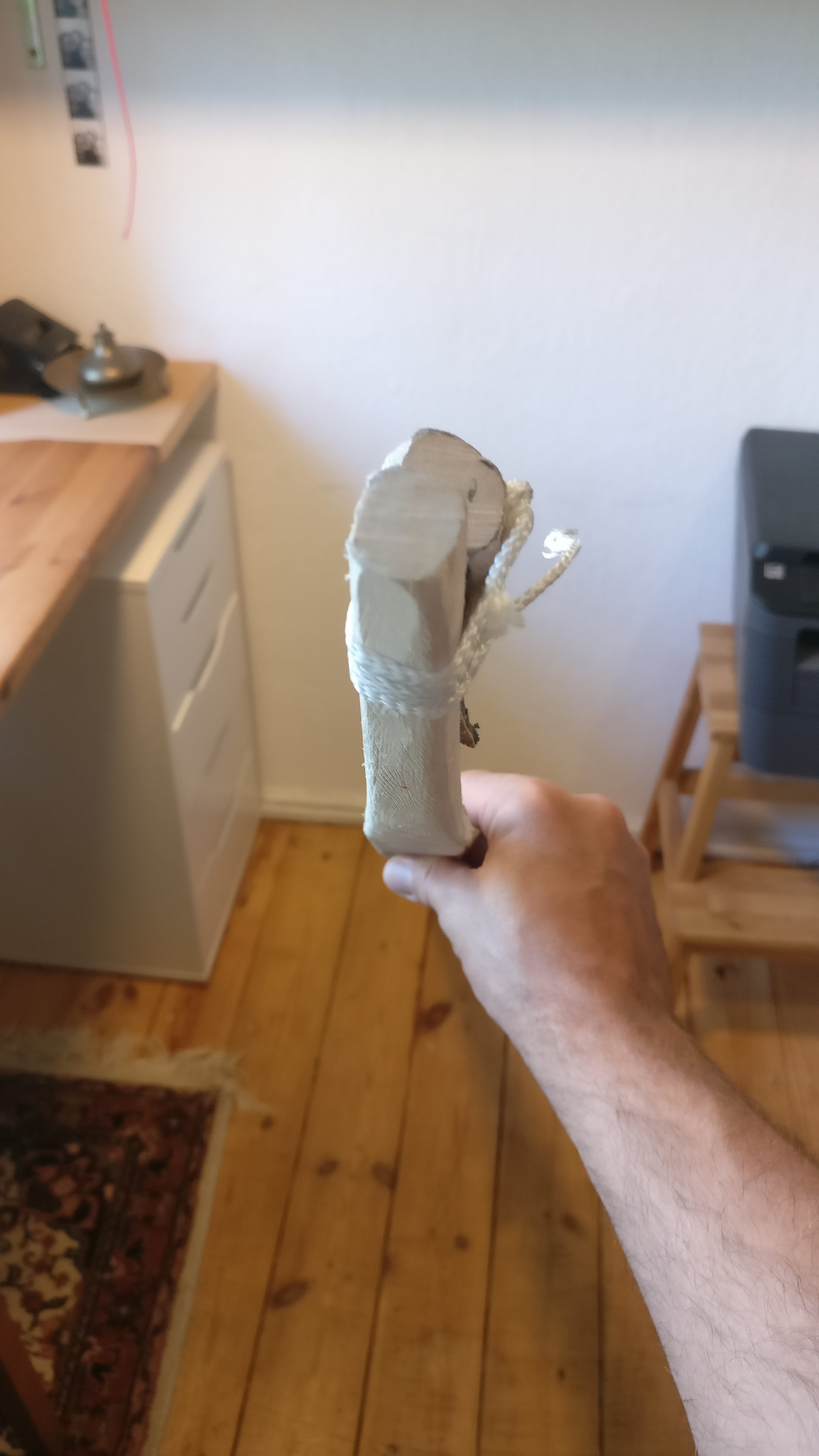 Könnte jetzt versuchen ihn ein wenig zu biegen/dämpfen, sodass er bei mittiger Lage an den Enden ebenso komplett mittig im Griff zu liegen kommt. Der Wurfarm wäre dann, da schon geschnitzt allerdings noch immer verdreht.