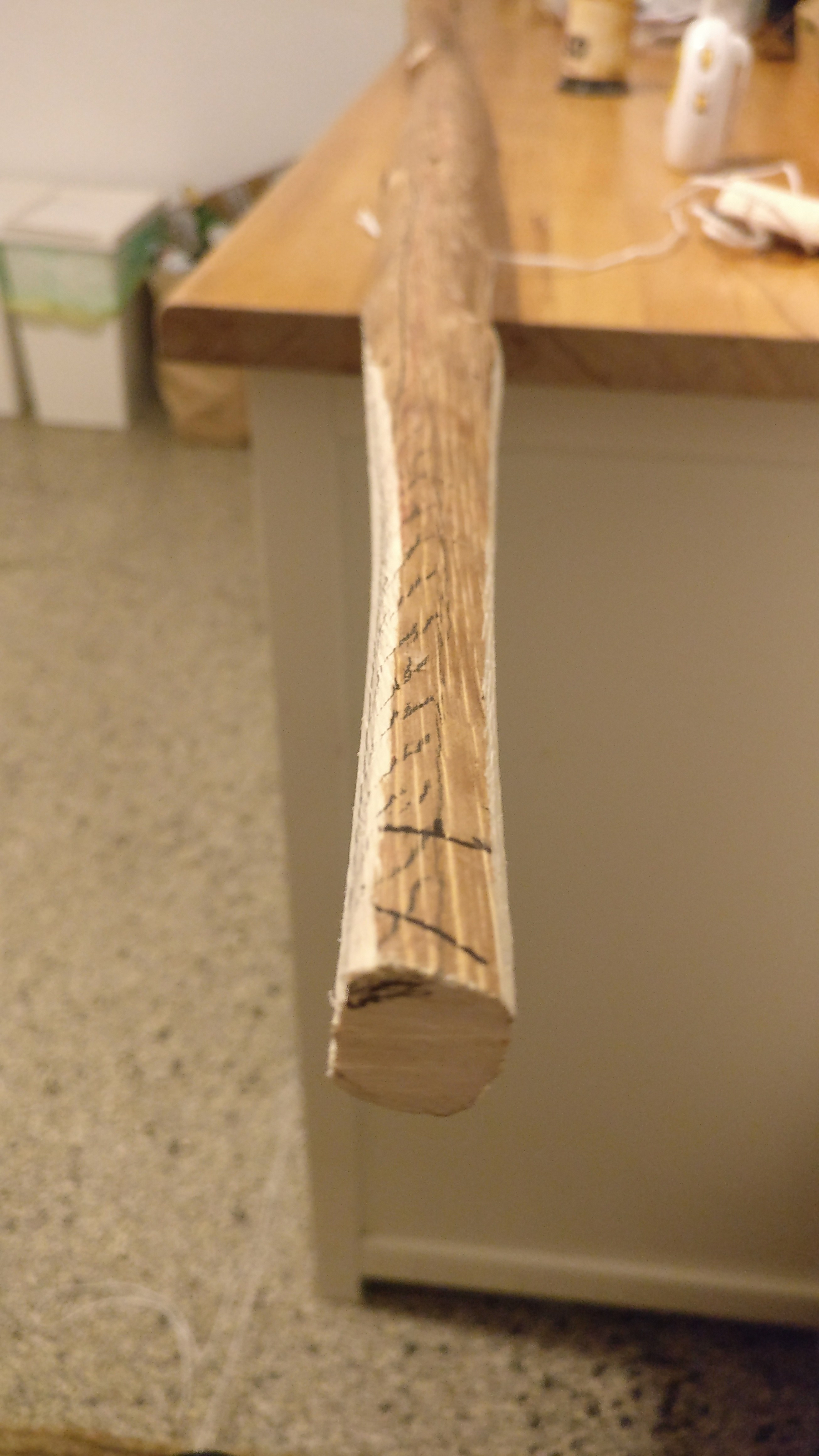 Im Griff ist ein Recht großer Ast. Macht sowas beim biegen Probleme? Macht es Sinn den Griff vor dem biegen schon ein wenig weiter auszuarbeiten, um nicht ganz so viel Material zu biegen? Wenn ja, ich wollte den Griff eigentlich etwa 2,5 cm breit (und 4 cm Tief) machen. Sollte ich ihn wegen des Astes lieber 3 cm breit machen? (Waren jetzt doch mehr als noch eine Frage