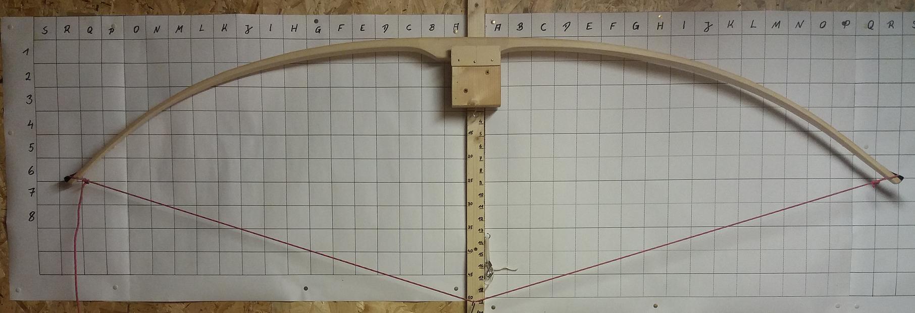 Den unteren Wurfarm zieht es nach links (Bild) und die Sehne aus der Griffmitte. Noch nicht ganz Standhöhe.