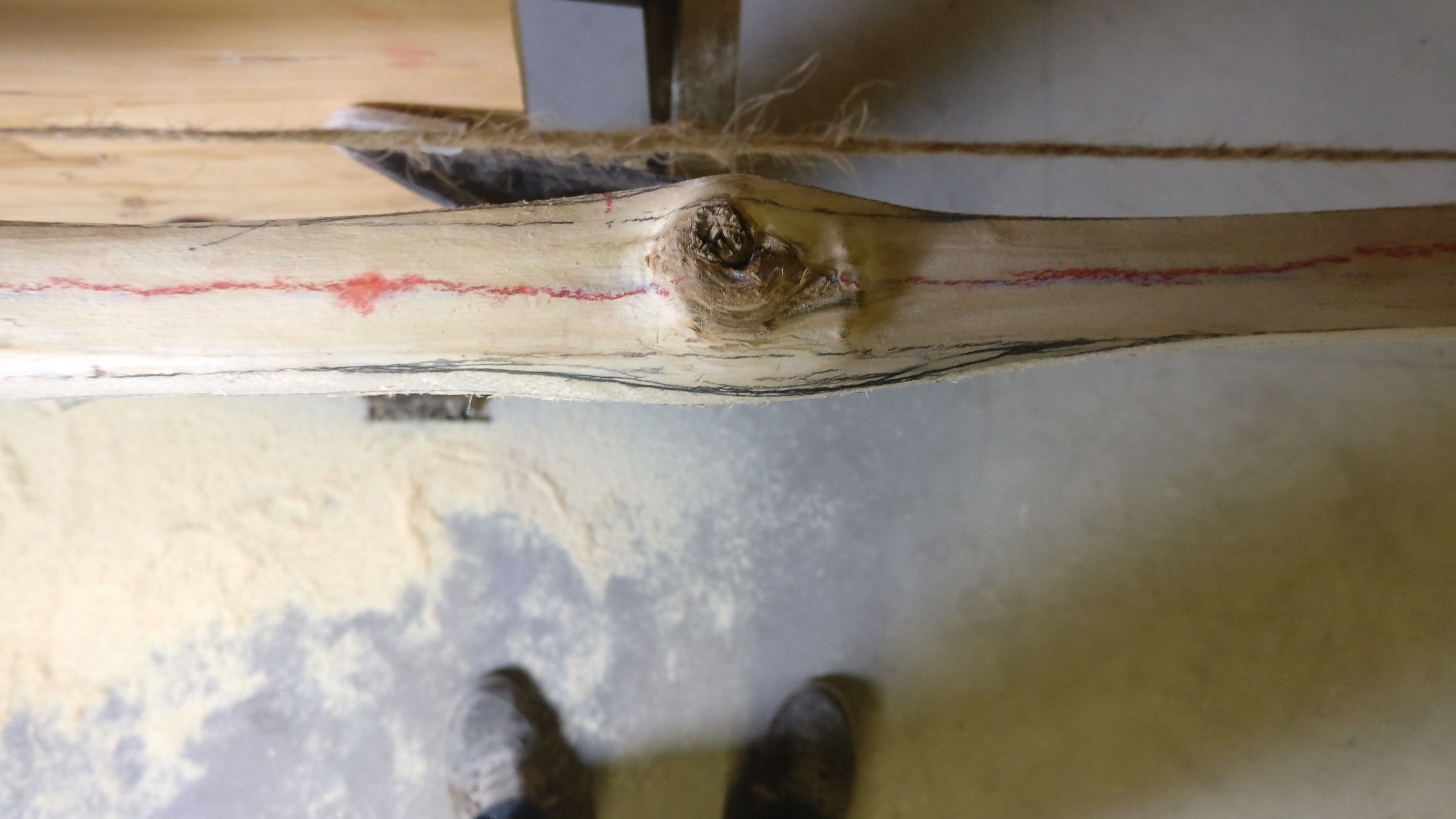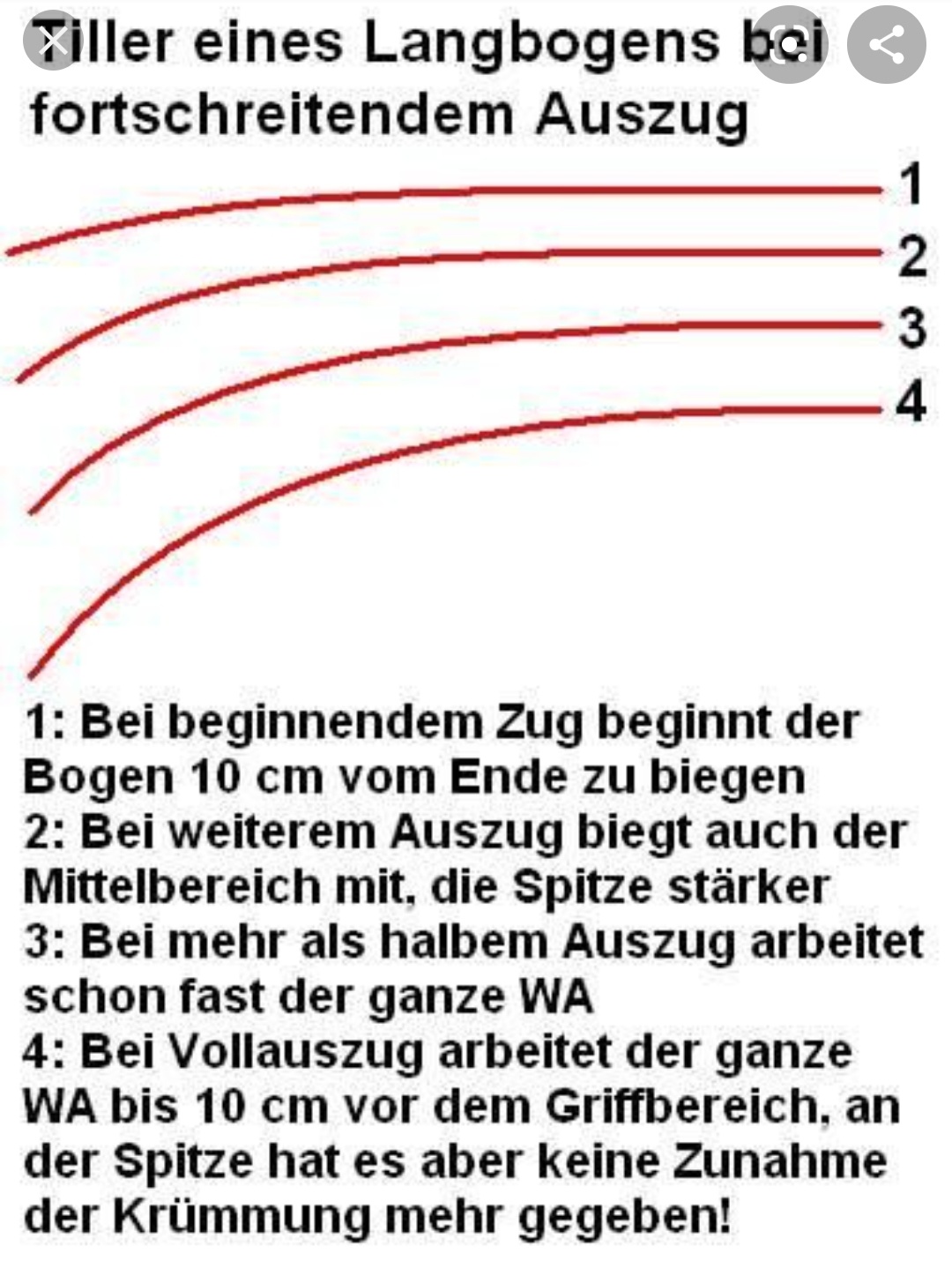 "Zu Beginn arbeitet er nur in der Hälfte zum Ende hin; je weiter es voran schreitet, desto mehr Holz in Richtung Griff arbeitet mit. Der Bogen "rollt" sich sozusagen "vom Ende her auf"! Beachtet aber, dass das allerletzte Stück am Ende immer steif bleibt, und auch bei Vollauszug der Schwerpunkt, also die maximale Krümmung etwas oberhalb der WA-Mitte liegt, und zum steifen Ende und zum Griff hin abnimmt..."