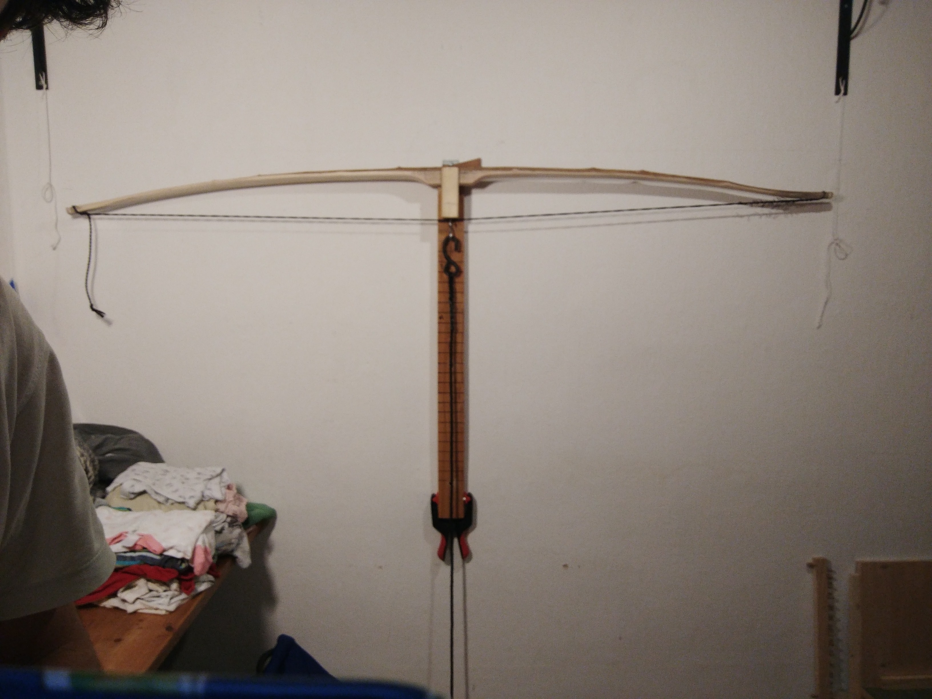 (Anmerkung: Da der Klotz auf dem der Bogen aufliegt länger als 5cm (aktuelle Standhöhe) ist, ist der Bogen auch auf dem "entspannten" Foto leicht ausgezogen und daher schon etwas gerader als er sonst wohl sein würde.)