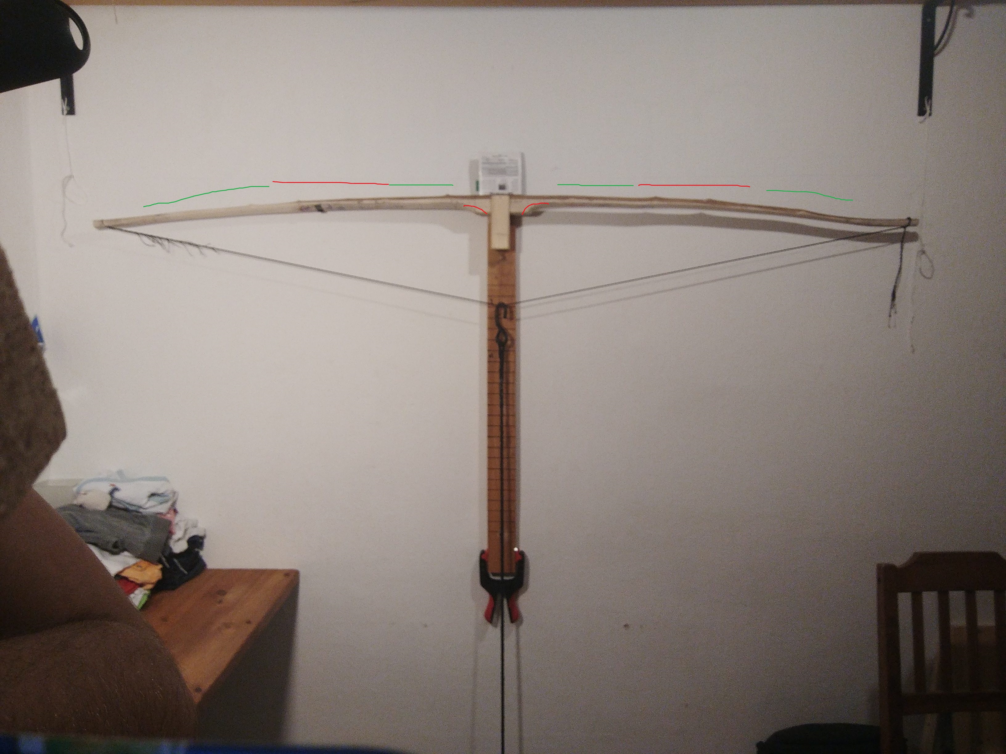 Aufgrund leicht asymmetrischer (denke sollte eigentlich nicht unbedingt so sein, aber muss jetzt wohl damit leben) Querschnitte und Designs der beiden WA, ist einer etwas schwerer als der andere. Denke das ist eigentlich nicht so wild und dachte den schwereren evtl. einfach als oberen Wurfarm zu nehmen, da er auf Grund der größeren Masse ja eh langsamer sein sollte.. (--> siehe Foto 1: hier liegt er nicht mittig, sondern austariert auf) Dennoch bereitet mir dieses Ungleichgewicht zunehmend Schwierigkeiten. Zu beurteilen, ob beide Wurfarme gleich stark sind, fällt mir seit dem der Bogen nicht mehr fixiert ist etwas schwer. Wie man sieht, liegt der Bogen anfangs leicht schräg (mittig) auf der Auflage. (Foto 2)