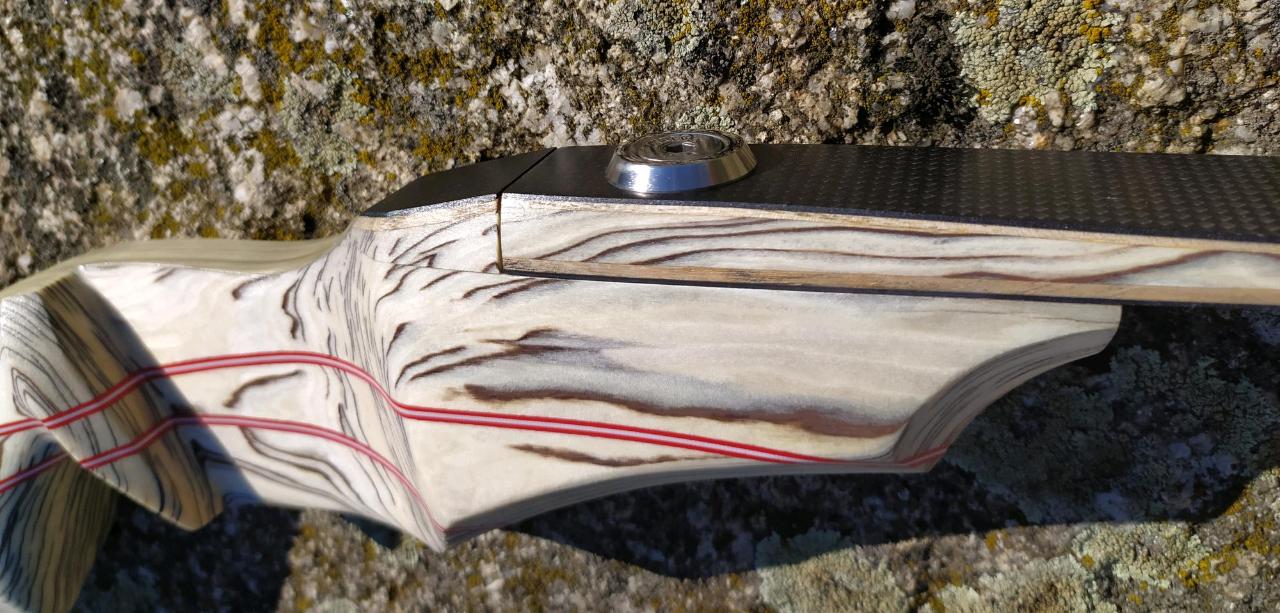 Riser: SaRaiFo "Betula Maser" mit Zierstreifen aus rotem und weißem G10 Wurfarme eingepasst, Overlay aus Klarglas am Rücken.