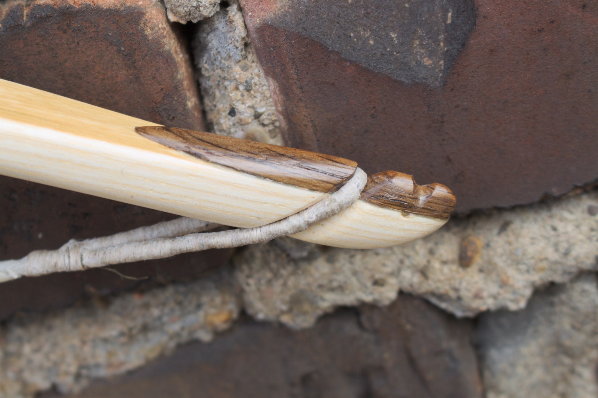 Sehne: 12 Strang BCY B55 weiß, zweifach flämisch gespleißt, Öhrchen- und Mittenwicklungen mit ungeblichenem Leinengarn, Wachs + Schmutz, Gewicht insges. ca 10g