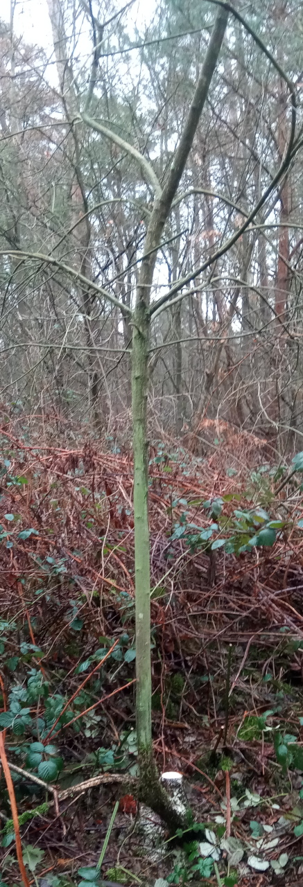 halbwegs frisch ging's zu der schon im Sommer ausgespähten Stelle. Pfaffenhütchen wachsen hier nur als kurze, dünne, kleine Büsche. Und dann fand ich dieses Ding! Bis zu den ersten Ästen 1,90m, sichtbarer Drehwuchs unten abgeschnitten noch 1,74m Länge, reicht. Unten etwa 6cm Durchmesser, oben ohne Rinde/Bast 5cm.