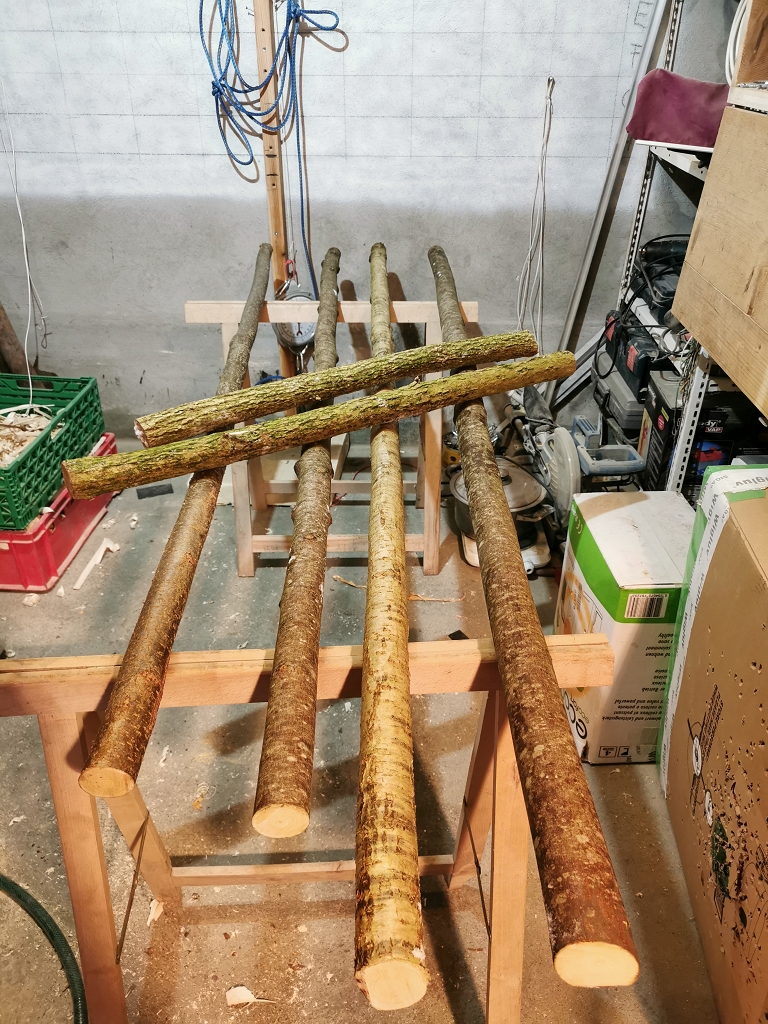 Der Bergahorn ergab zwei Stücke eines ist noch nicht entrindet, einen zusätzlichen Hasel liegt auch noch bei, ebenfalls nicht entrindet. Die zwei Hollerstücke habe ich mit der BS geteilt. Enden sind versiegelt und alle warten geduldig bis sie wieder unter s Messer dürfen