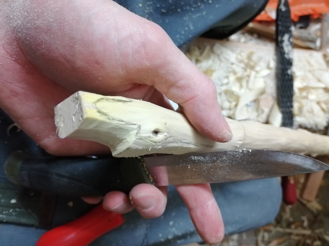 Zuerst wurde K1 bauchseitig runtergeschnitzt und entrindet: