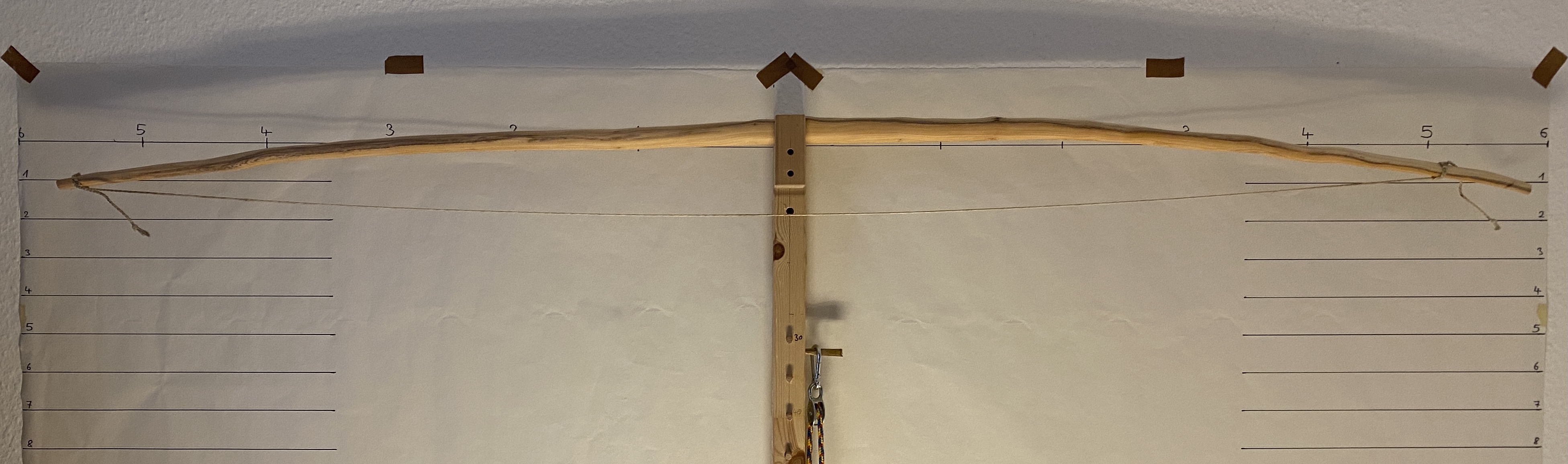 Eben wollte ich nochmal in Standhöhe mit der Tillersehne die korrekte Sehnenlänge feststellen und das Zuggewicht in Vollauszug messen.