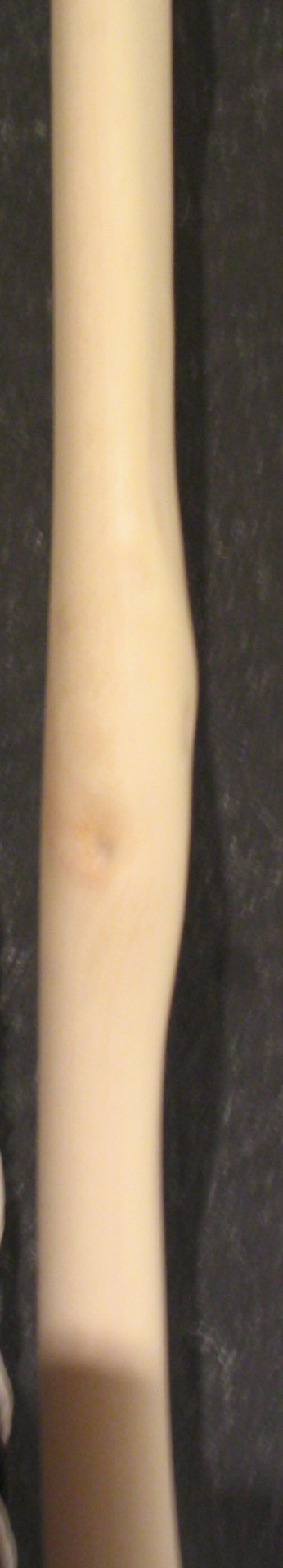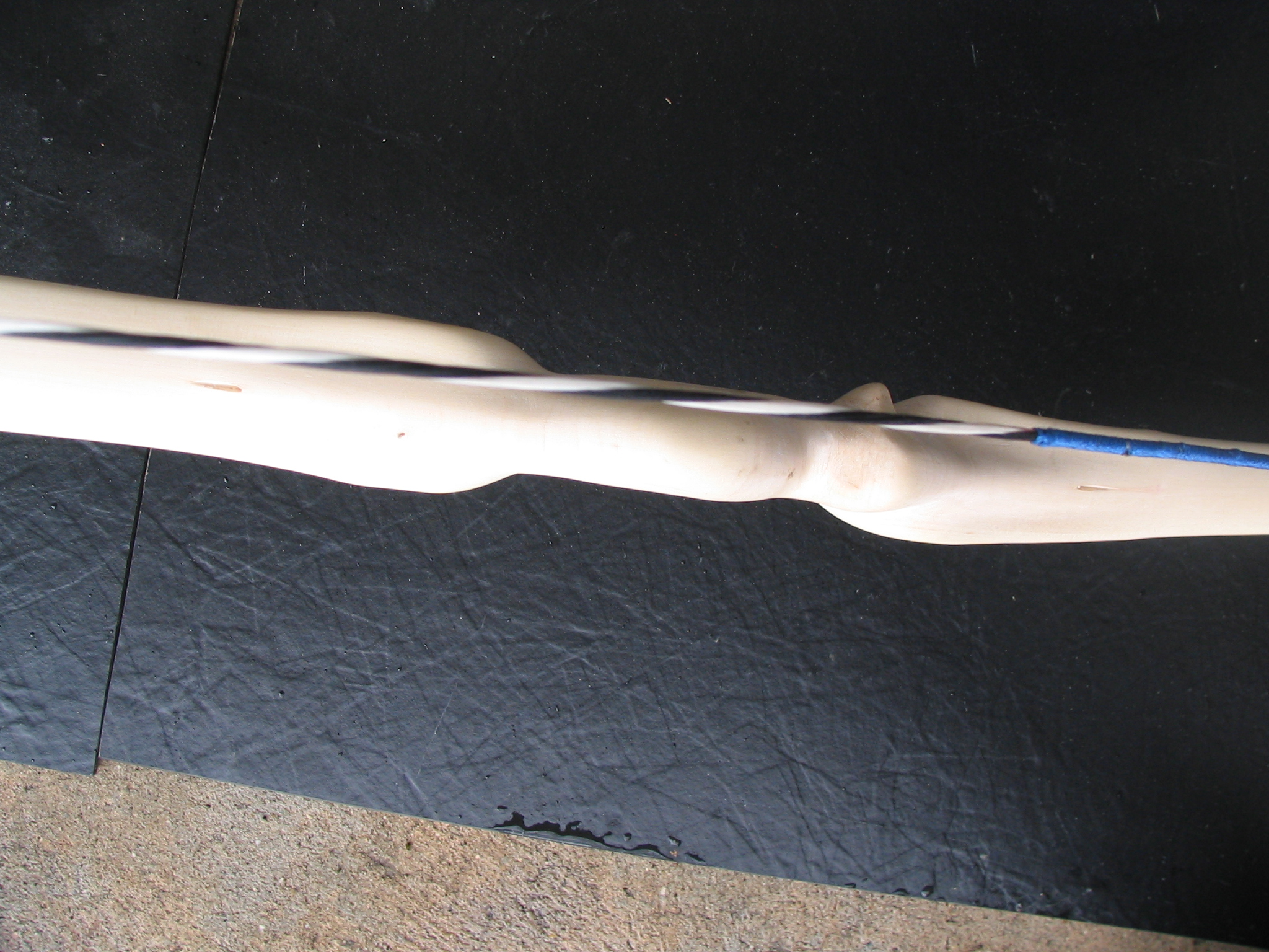 Ach ja die kleine Faulstelle vom Anfang konnte ich ganz runterarbeiten , und der Totast am oberen Wurfarm konnte ich auch so weit rausarbeiten , daß sie nicht mehr relevant ist. Man sieht nur noch ein kleines Löchlein. Die Auflagen für die Nocken habe ich aus Rehgeweih gemacht und mit wasserfestem Holzleim drauf geleimt. Sehnenlage ist leicht nach links versetzt, was aber nicht weiter schlimm ist da ja die Pfeilauflage auch links am Bogen ist. Bin momentan bei ca. 55 cm Auszug und 40 bis 45lb' s und einem Gewicht von ziemlich genau 700 g,
