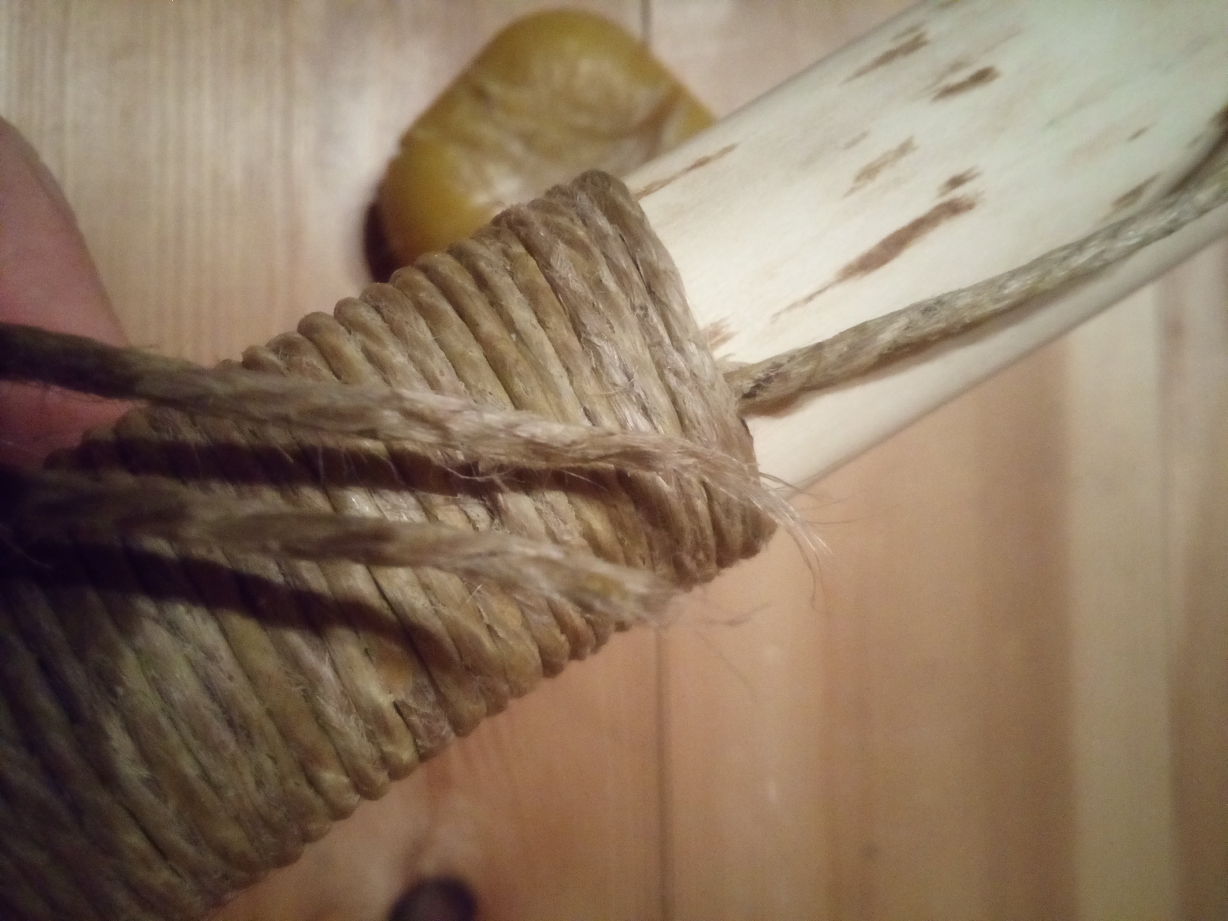 Ich habe mich gestern Nacht noch spontan für eine Griffwicklung entschieden. Ich hatte noch ein etwa 3mm starkes (Jute?)-, oder so ähnlich, Garn herumliegen. Gewachst fusselt das auch nicht und gibt einen leicht klebrigen, rutschfesten Griff.