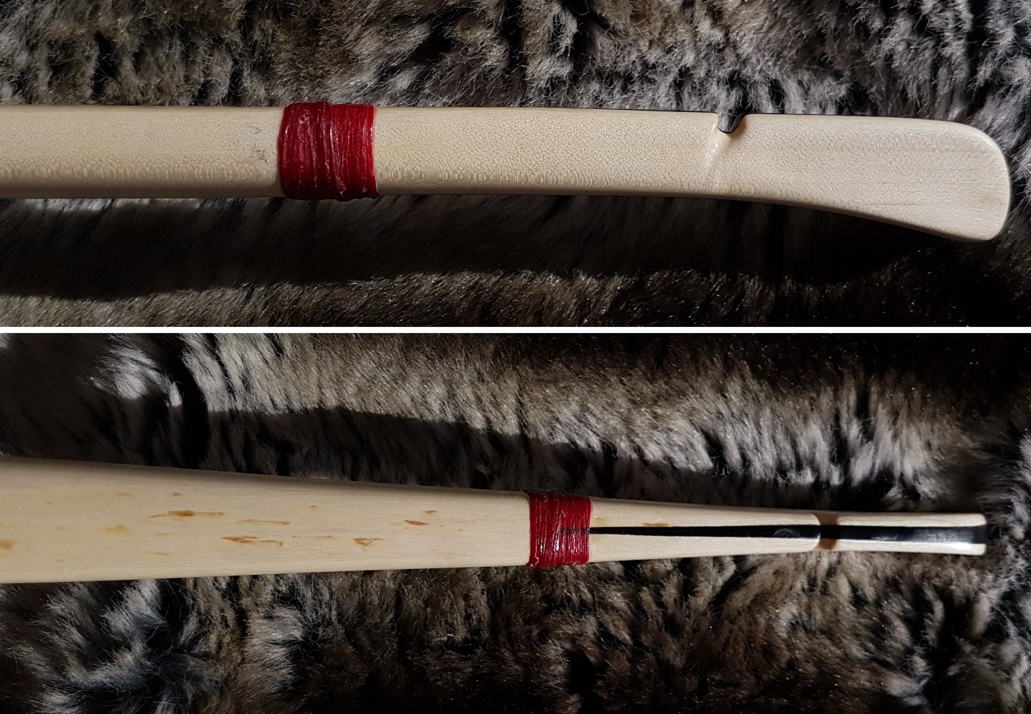 Macht mit Daumen richtig Laune und wirft auch schwere Pfeile überraschend schnell und ohne Handschock. Die Japaner wussten schon, was sie an dem Design haben. 2 Dinge, die mich einfach freuen: erstens dieser perfekte Rohling - sowas findest du einmal in ein paar Jahren. Zweitens das Pfaffenhütchen an sich - immer wieder schön, wie lebendig und schwingfreudig das Holz ist. Dagegen wirkt die Kornelle wie ein Nudelholz.