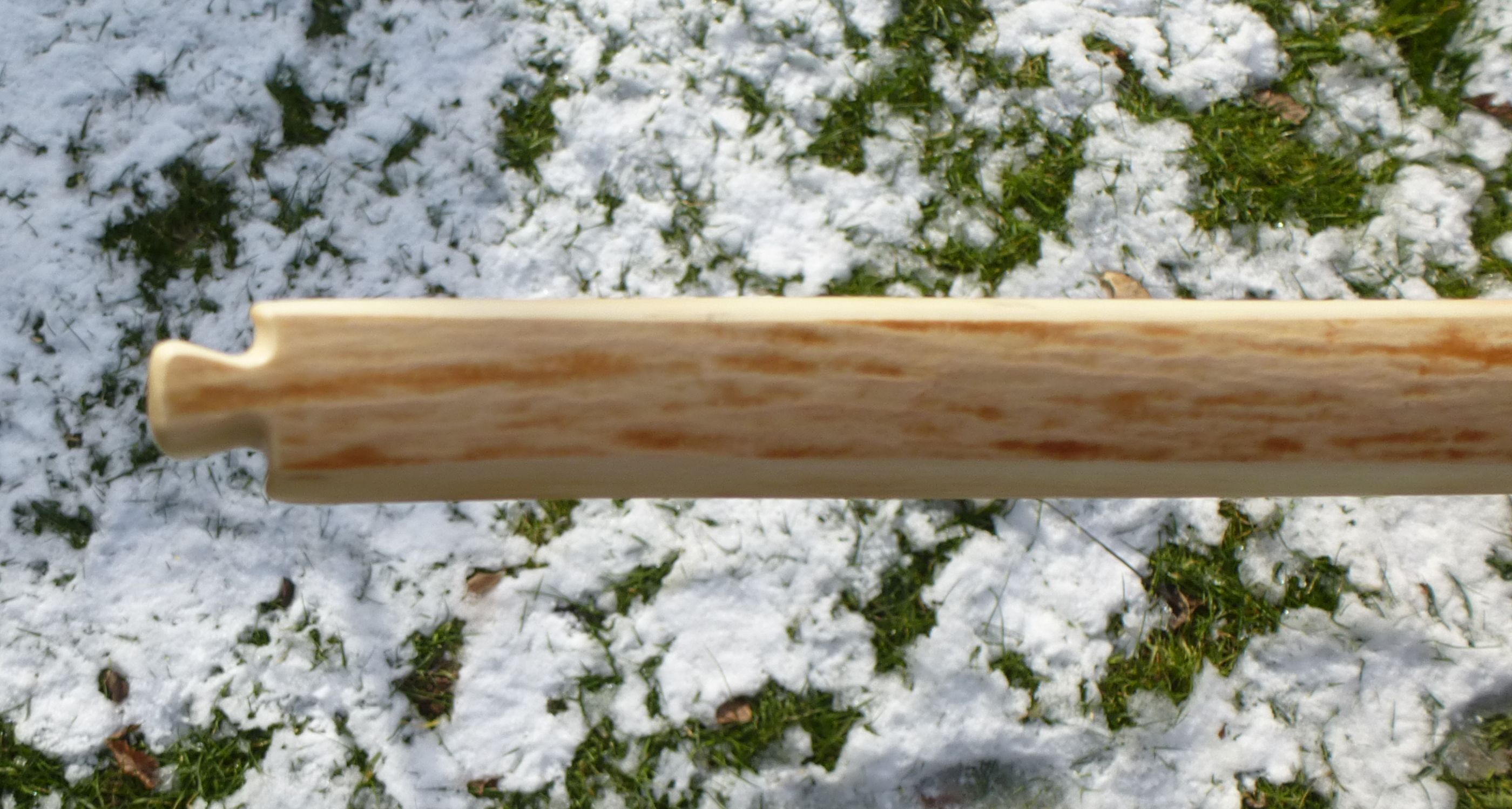 Die Inspiration zu diesem Bogen waren die Oberflacht-Bogen. Der Griff biegt bei dem hier etwas mit, ganz steif ging aufgrund der Saplingdicke nicht. Aber egal.