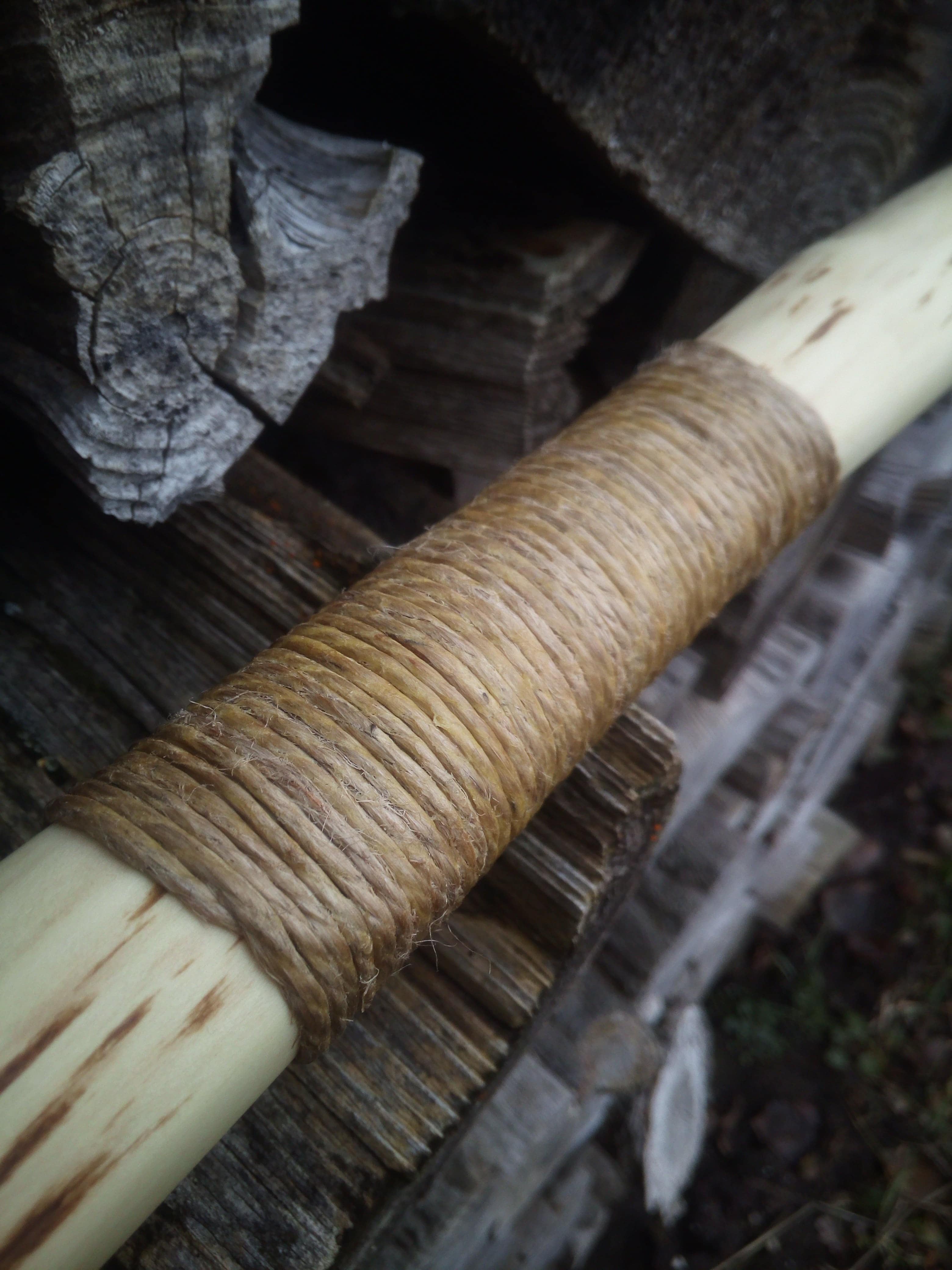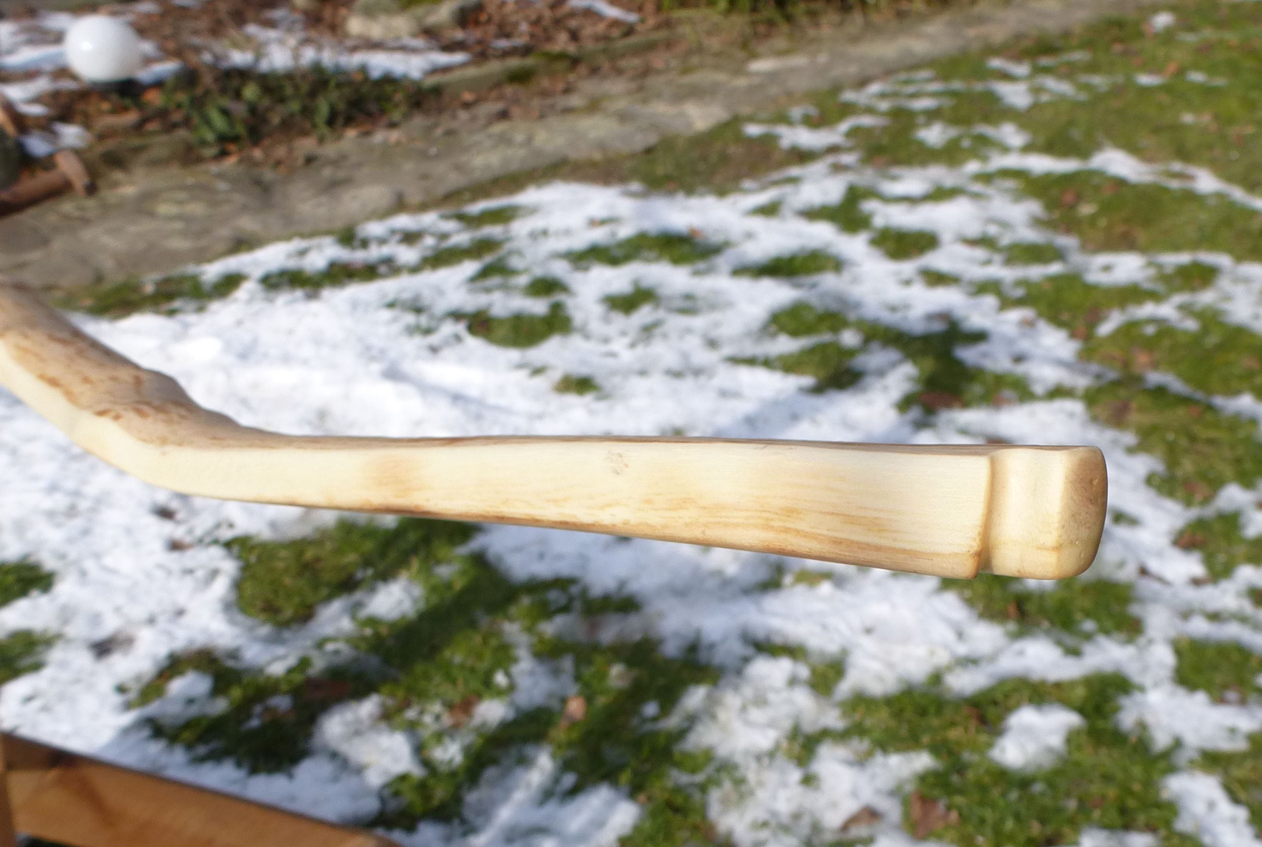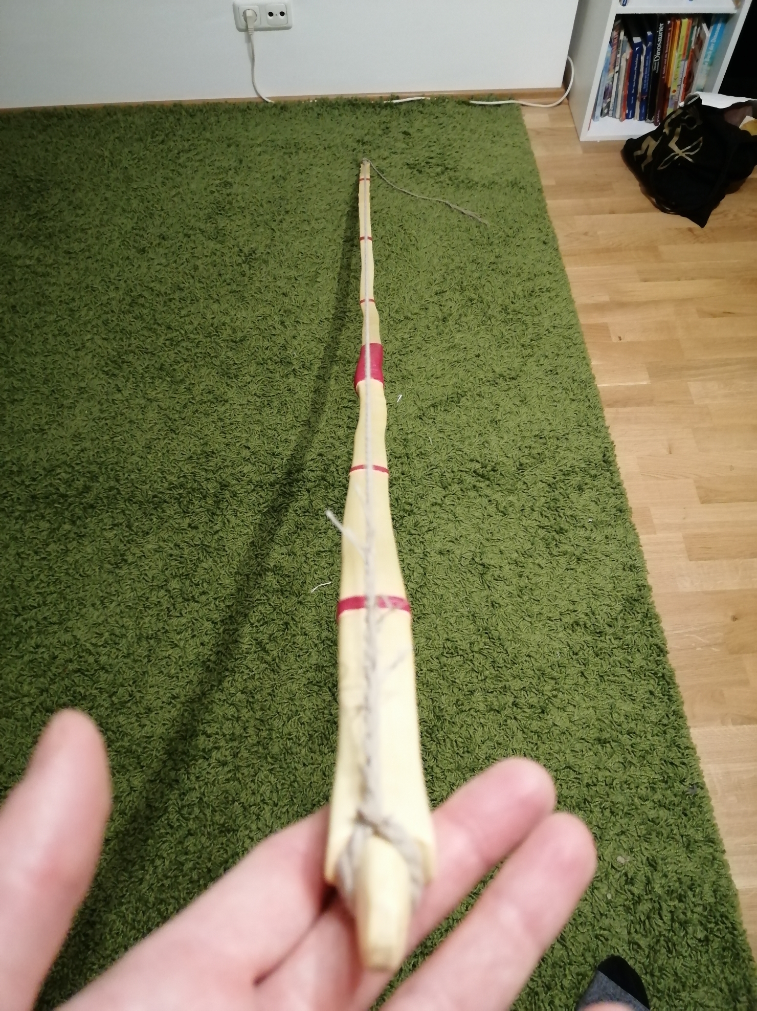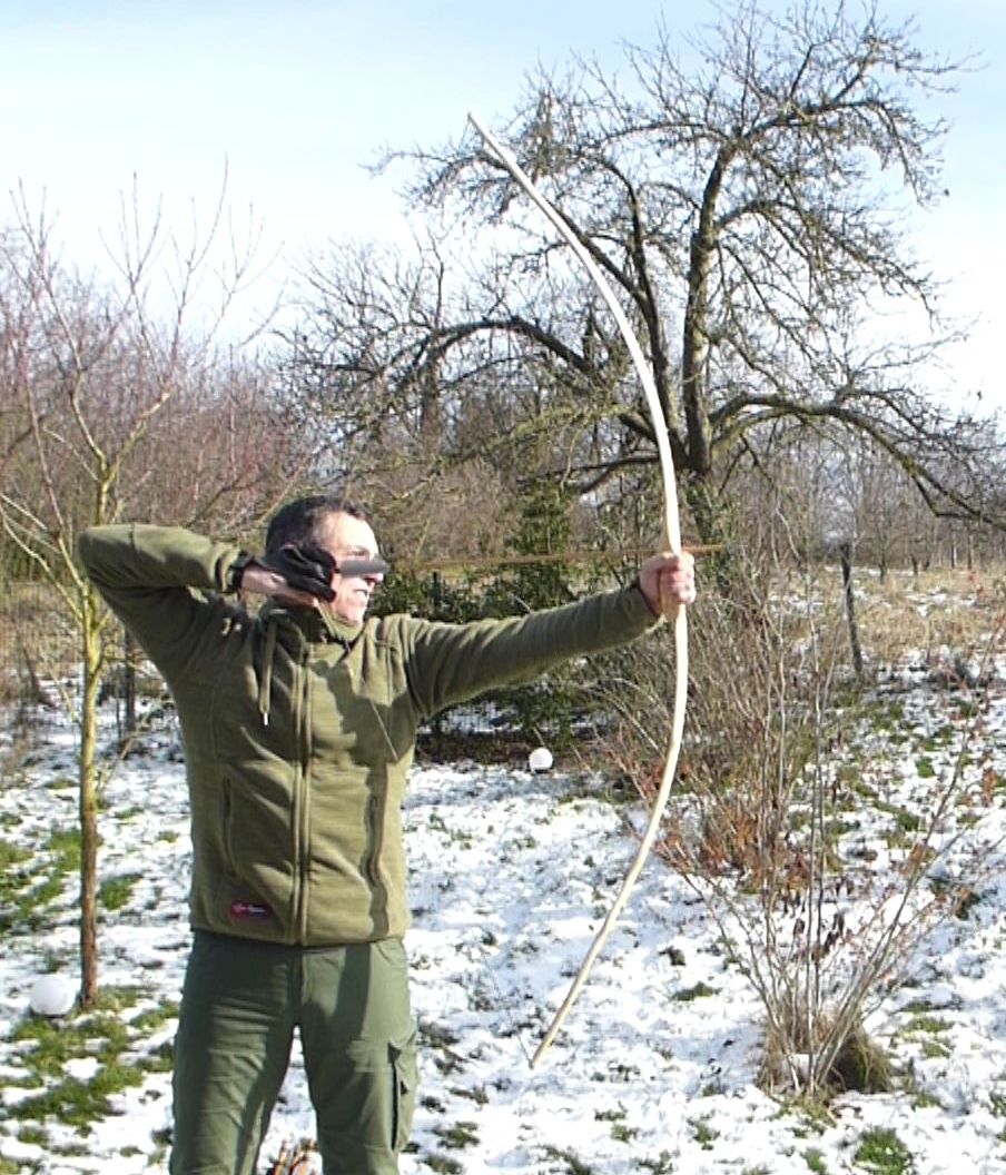Die Inspiration zu diesem Bogen waren die Oberflacht-Bogen. Der Griff biegt bei dem hier etwas mit, ganz steif ging aufgrund der Saplingdicke nicht. Aber egal.