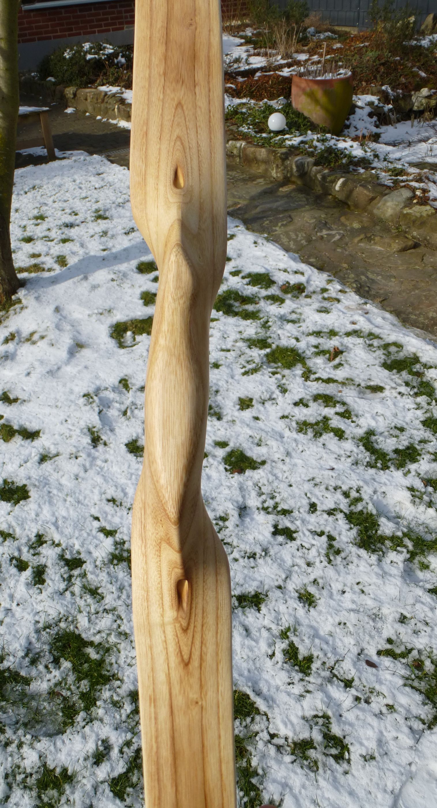 So, hier nun die Esche1 aus dem gehegten und gepflegten Bäumchen. Zum Bauthread geht's hier. Die Reflexe am Ende der Wurfarme sind so gewachsen und ergeben einen Gesamtreflex von 8cm. Da sich der obere Wurfarm beim tillern noch ein wenig nach links verzogen hat, habe ich mit dem Z-Griff fast einen Centershot.