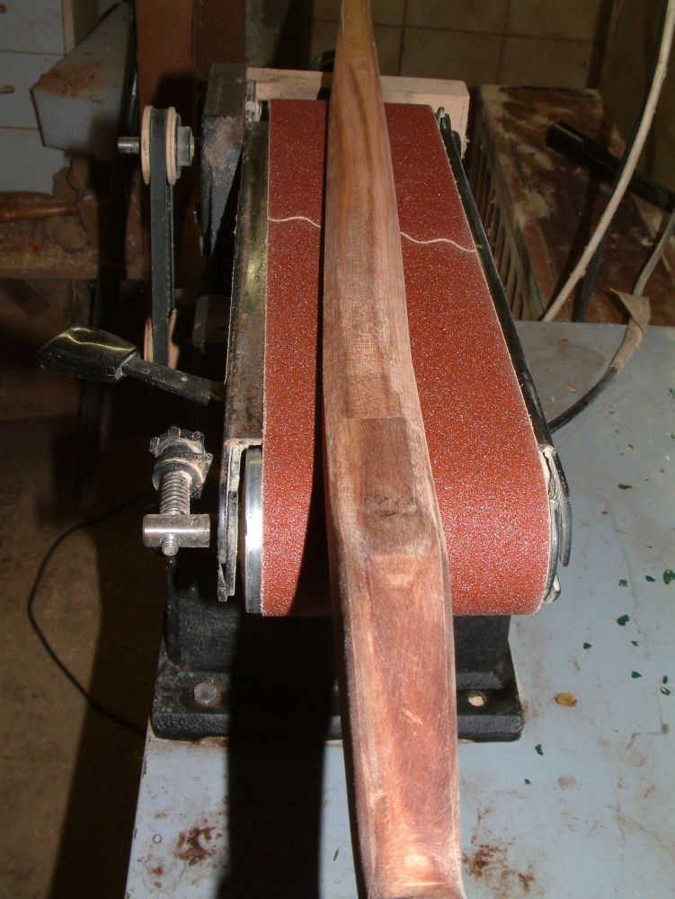Meine ersten drei Messer habe ich mit einem Handbandschleifer, den ich auf die Werkbank gespannt habe, gemacht. Für Nummer 4 bis 9 habe ich mir so einem Kombischliefer (Band / Teller) zugelegt. Ich habe mir hier allerdings Bänder mit verschiedenen Körnungen gekauft) Die Fa. Scharnau war hier recht hilfreich. Ab 10 dann mein erster Eigenbaubandschleifer. Im Herbst dann Eigenbau Nummer zwei.