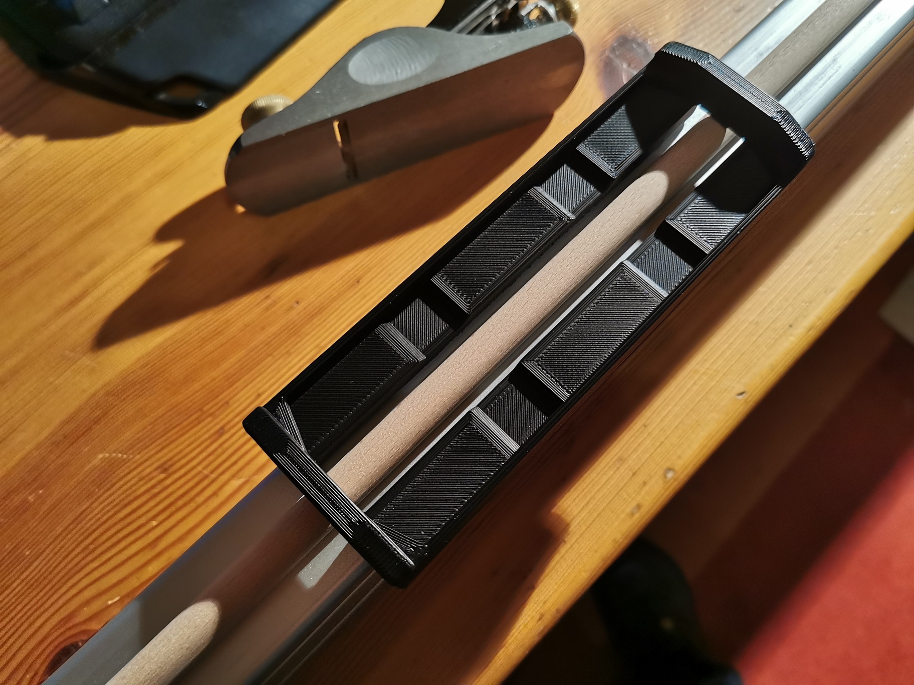 Hier die neue Lade mit 40er Aluprofil und dem Hobel für 1/2" Pfeile. Ich hab noch ein paar Buchenholzrundstäbe in der Ecke stehen gehabt vom Basteln mit meinem Kleinen, den habe ich als Schaftmodel gebraucht.