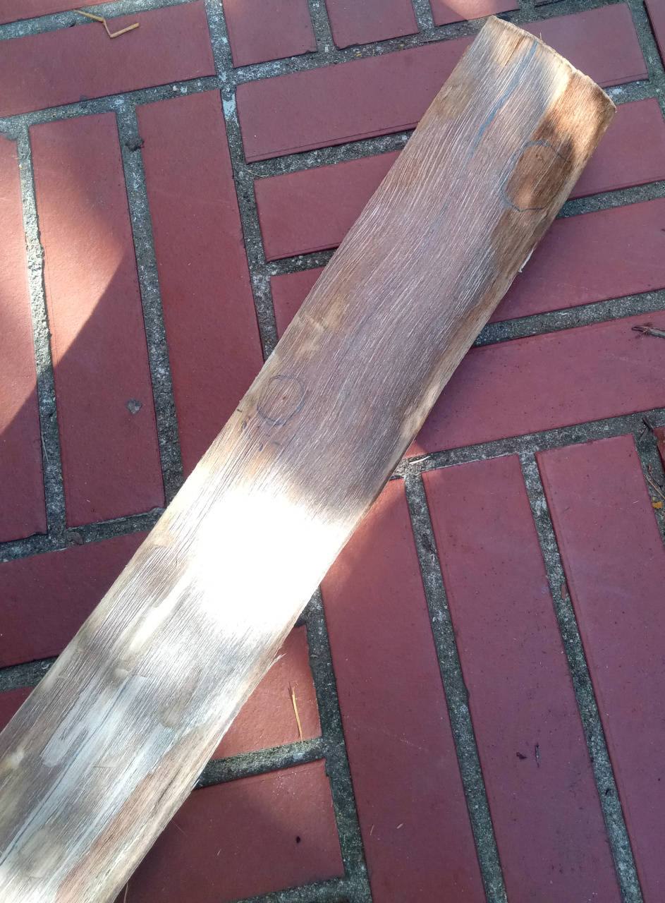 Also man nehme den ungarischen Osage-Stave mit ordentlicher Länge: Dann erstmal Jahresringe an Stirnseiten angucken: Also man soll Osage ja sogar im Jahresring spalten können. Hmmja, also mal ganz verwegen und größenwahnsinnig was einzeichnen: Und dann legen wir doch mit allerlei Werkzeug mal los: Nagut, es läuft so einigermaßen: Aber aber leider bleibt der Riß nicht zwischen zwei Jahresringen, es wurde also nichts. Wie sich später zeigte, hat dieses Stück enormen Zusammenhalt zwischen den Jahresringen und der Faserverlauf hätte ein solches Abspalten sowieso vereitelt.