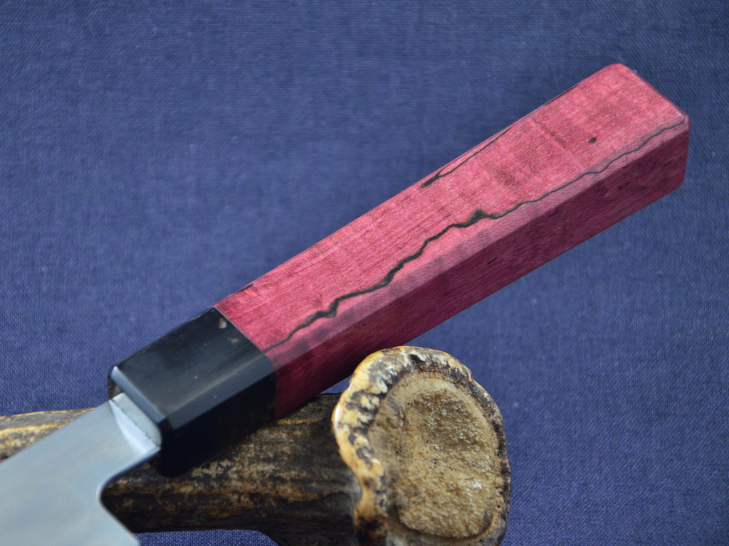 Griff: Gestocktes Ahorn, rot eingefärbt und stabilisiert, Zwinge aus Büffelhorn. Sieht etwas aus wie Amaranth. "Tropenholz" aus heimischen Regionen.