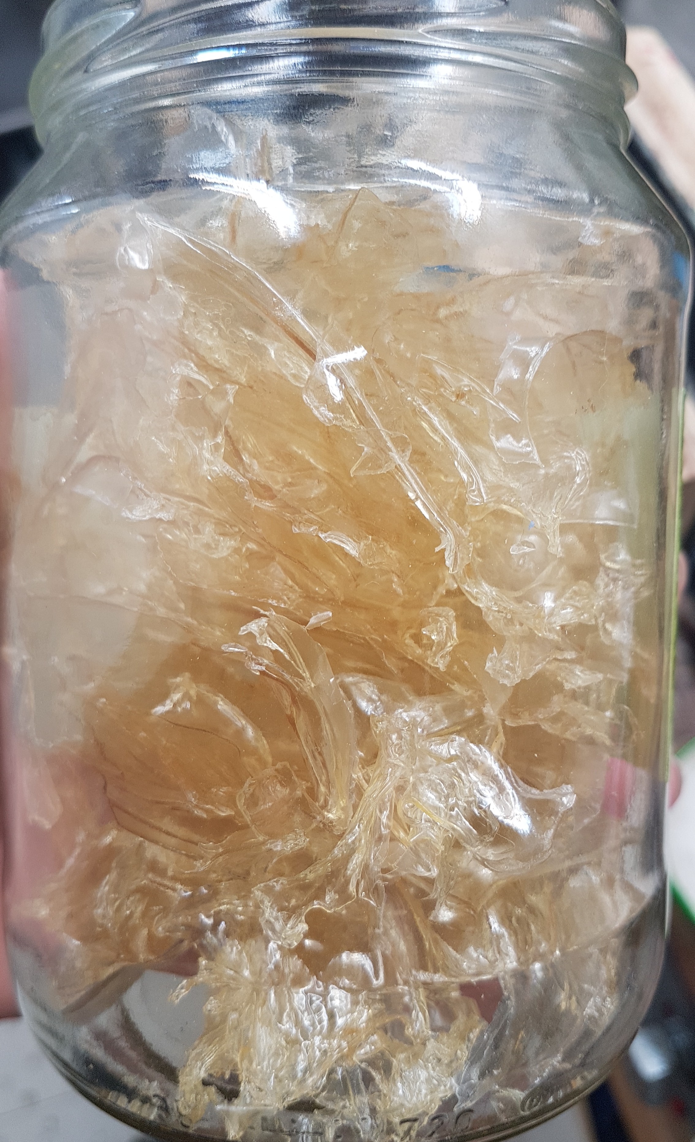 Aus 200 g getrockneten Sehnenabfällen wurden 100 g getrockneter Leim (erste Charge 63 g).