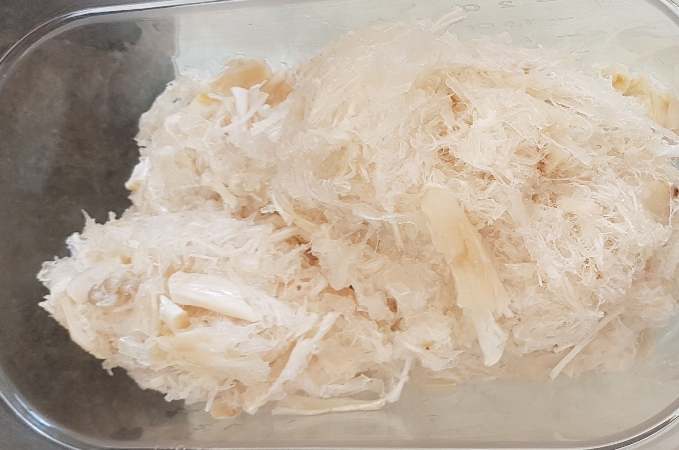 Vorbehandelt wurde dieses Mal nur 6 Tage (wenn ich das richtig erinnere, es können auch 7 gewesen sein), wieder im Kalkwasserbad (pH-Wert zwischen 12,5-13), dieses Mal aber bei Zimmertemperatur. Im letzten Waschwasser wurde dann ein Schluck 24% Salzsäure zum entfernen evtl. Kalkreste zugegeben, nochmals gründlich ausgewaschen und händisch ausgepresst.