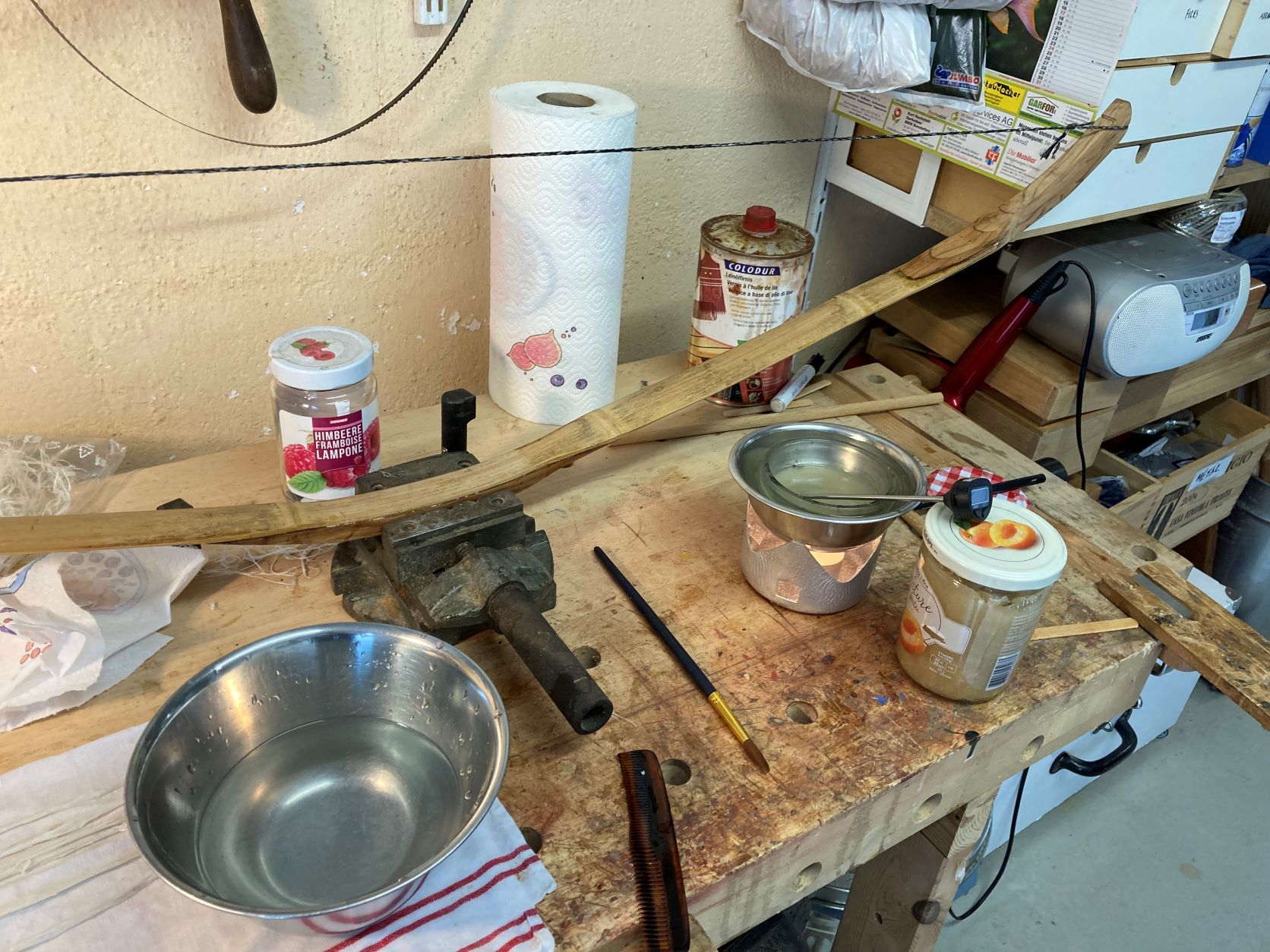 Zurzeit hängt der Bogen umgekehrt (an der Spannschnur aufgehängt) im nicht beheizten Estrich und trocknet weiter. Ich rechne damit, dass die trockene Luft im Winter die restliche Feuchte entfernt, so dass er dann im Frühjahr einsatzbereit ist. In der Zwischenzeit arbeite ich am zweiten.