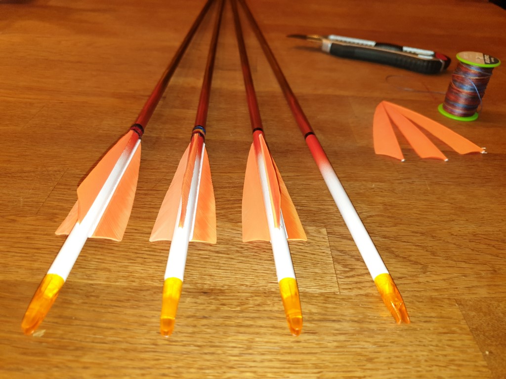 Meiner Frau gefallen sie. Deshalb schießt jetzt sie diese Pfeile, und ich die anderen, die ich kurz vorher auf ihren Wunsch hin in gelb gebastelt hatte. Naja, bei denen hatte ich das Würstchenglas noch nicht, so dass das Cresting kürzer und teilweise ungleich lang ist, und die Farbe birgt dazu wohl immer noch ein gewisses Kopfschmerzrisiko...