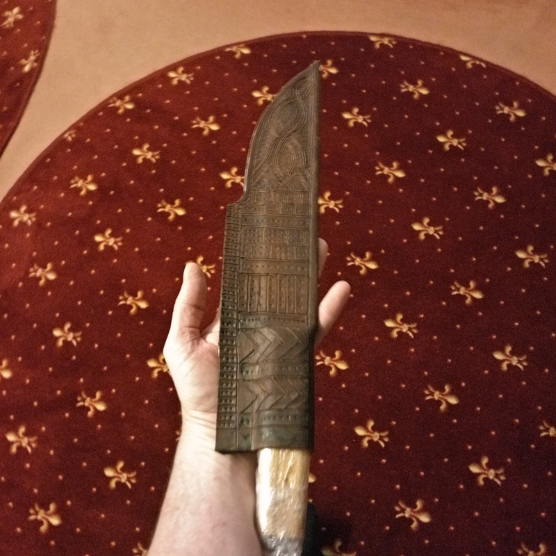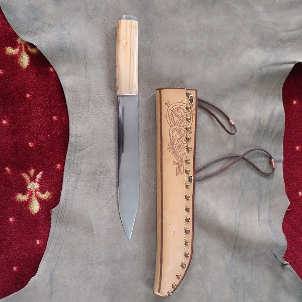 Wieder ein altes Sägeblatt benutzt und ähnliche Bauweise der Saxscheide aus natürlich gegerbtem Leder mit 3mm Stärke.