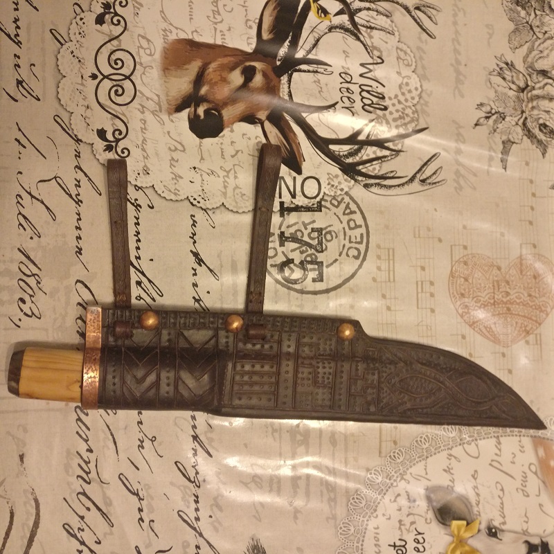 Die meiste Arbeit macht die Saxscheide mit den Verzierungen, einlegen in Wasser, pressen, und die verzierungen vorzeichnen, einschneiden mit dem "Lederswiefel" und anschliessend nochmals mit dem Kugelpin nach drücken. Am besten Fungernägel kurz schneiden, sonst sind schnell auch die auf dem Leder. Anschliessend wieder mit Lederfarbe bestreichen und kräftig mit Fett einreiben. (Motorradkombifett) Der Griff aus Eibe und einem kleinen Stück Horn von einem Allgäurind. Die Angel geht komplett durch den Griff bis hinten zu Horn.