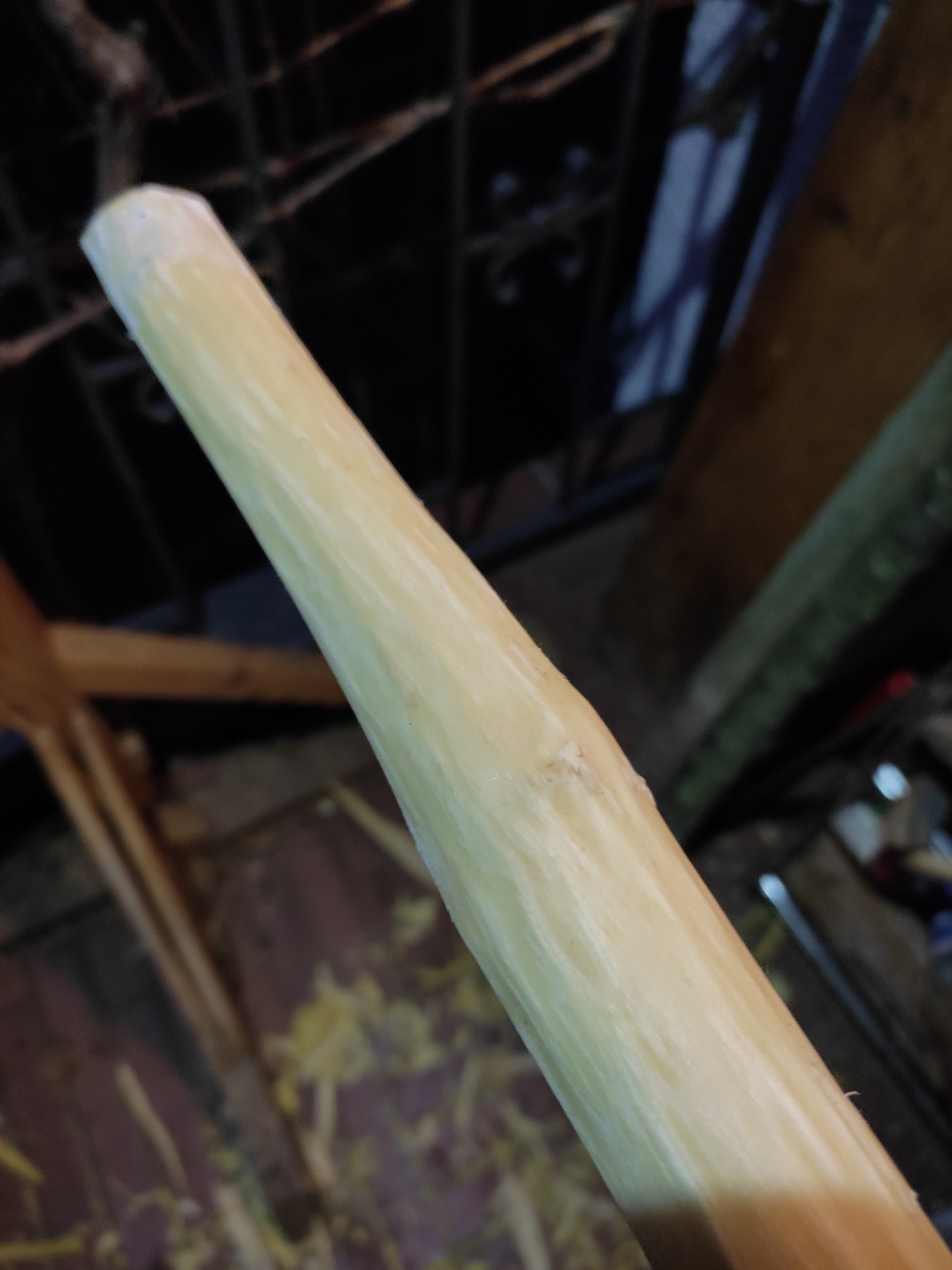 Die Breite überall gleichmäßig etwas verringert, Rinde und Bast ab, überall bis auf Griff runter auf Markkanal. Direkt vor dem Fadeout war so ein Ast. Zuerst habe ich überlegt, den Griff noch mal zu verschieben, aber der Ast war nur auf der Bauchseite und fiel sowieso weg.