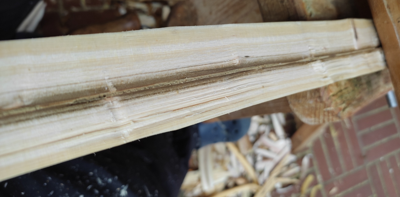 Also was tun, Reststück grob auf rechteckige, eher schmale Form bringen (Stabbogen). Geht im Wesentlichen schon noch, hat an einem Ende aber krass seitliche Biegung. Habe es dann zum Trocknen mit viel Zwingen und Kraft an eine Bohle gezwungen (ohne Hitze behandelt). Gebe dem keine große Chance. Vielleicht hätte ich noch Hitze ausprobieren sollen (Dampf).